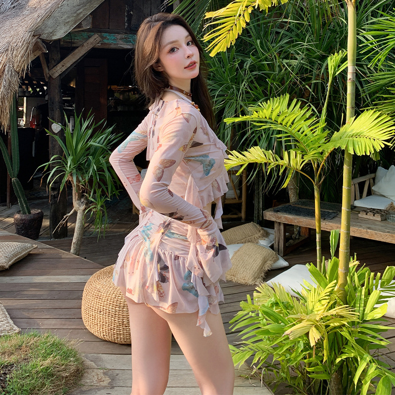 수영복 여성 비키니 4 피스 세트 스플릿 슬리밍 보수 2024 새로운 온천 꽃 작은 가슴 모임 수영