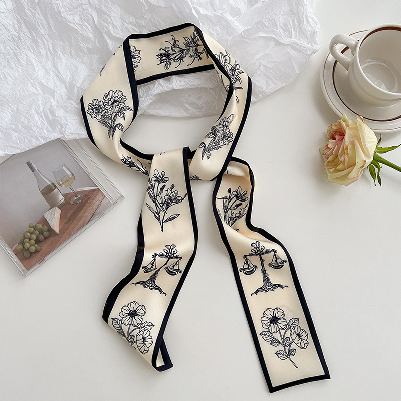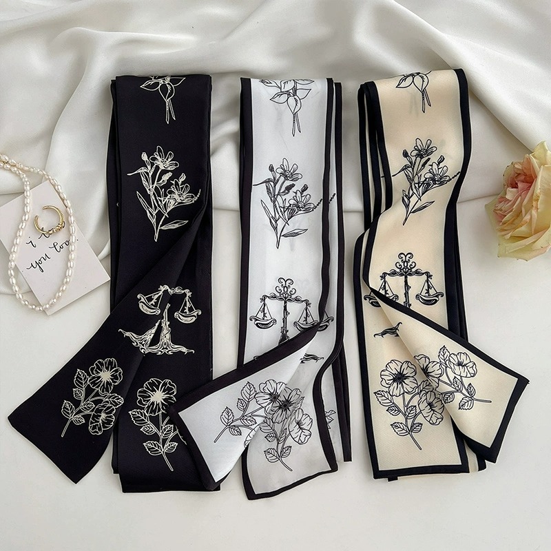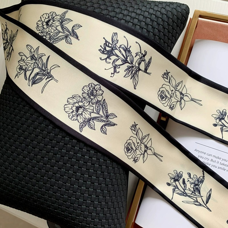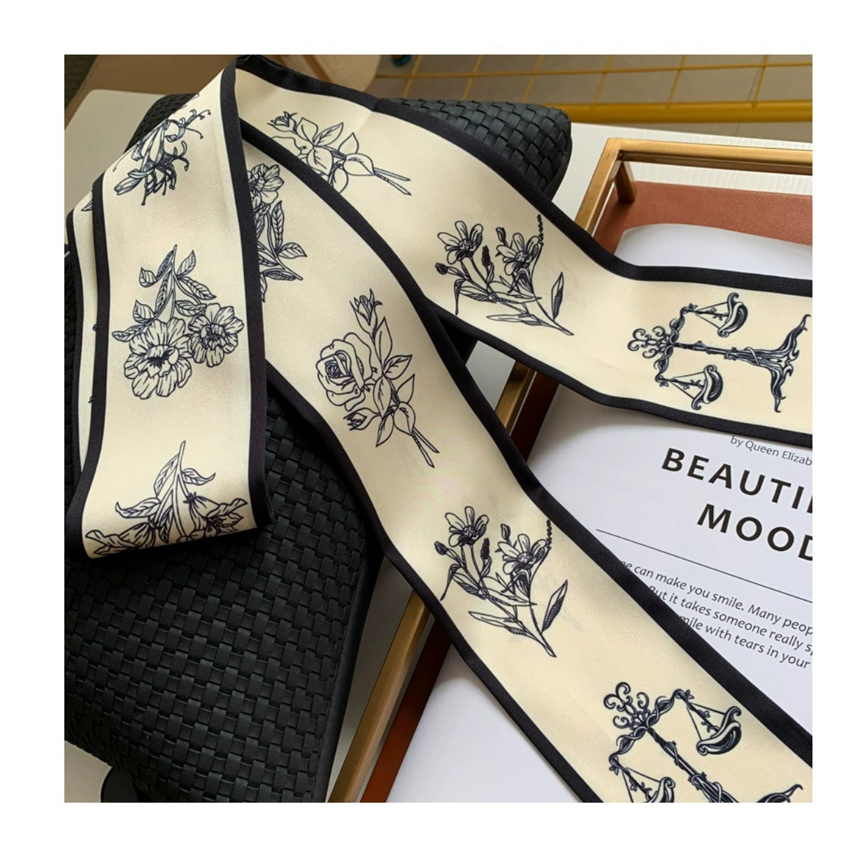 프랑스 스타일 로즈 프린트 긴 스카프 하이 엔드 우아한 레트로 헤어 타이 리본 여성 올 매치 레트로 로맨틱 헤어 밴드