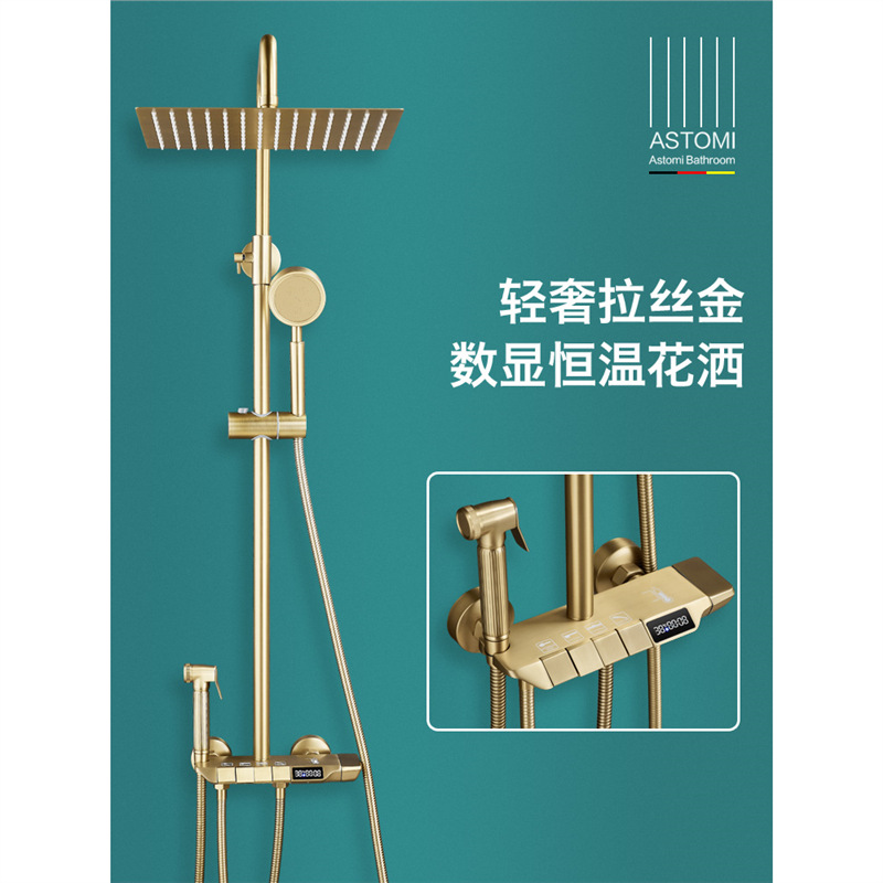 와이어 드로잉 골드 샤워 세트 샤워 가구 피아노 키 욕조 욕실 일정한 온도 디지털 디스플레이 압축 꽃 건조 노즐스토어 가기