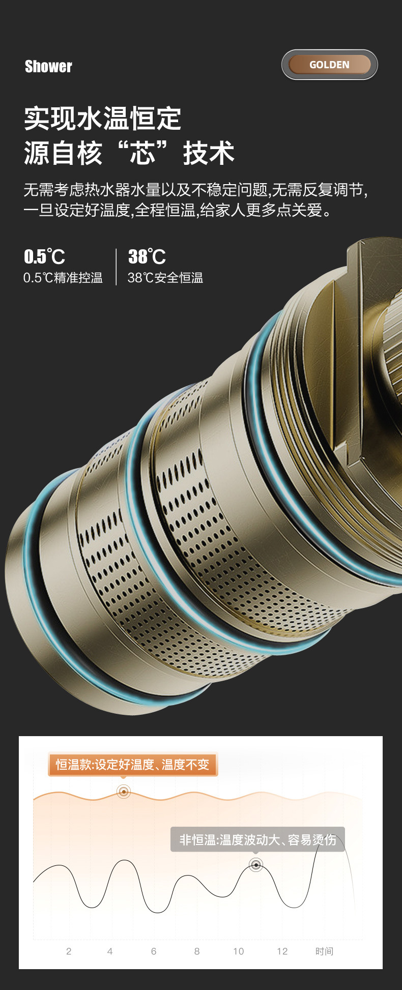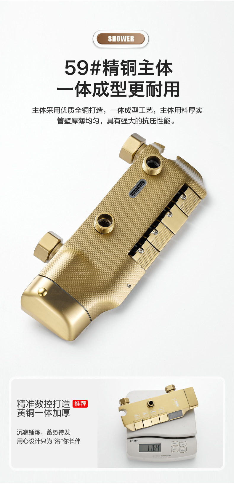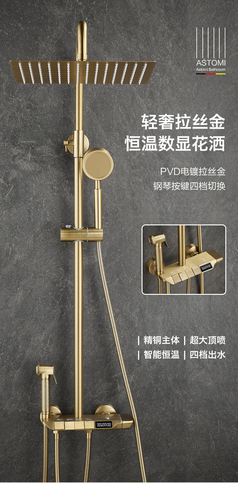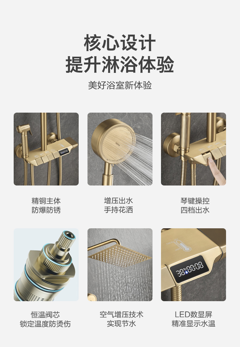 • 브러시드 골드 라이트 럭셔리 디지털 디스플레이 - 항온 4단 샤워 스테인레스 스틸 노즐