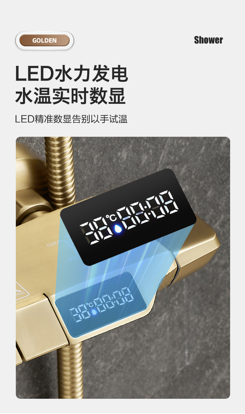 • 브러시드 골드 라이트 럭셔리 디지털 디스플레이 - 냉온 4단 샤워 스테인레스 스틸 노즐
