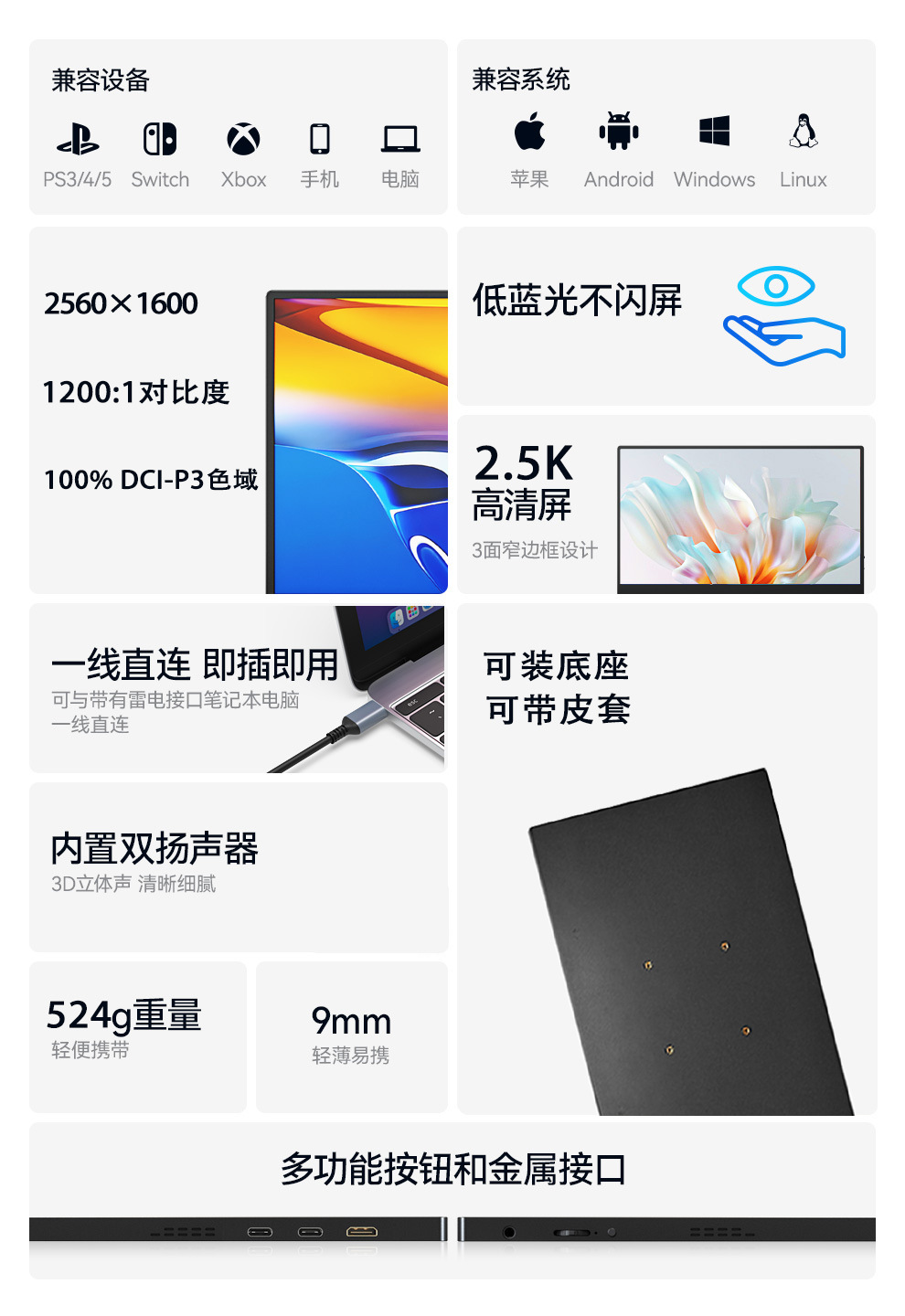 ZWBA 휴대용 모니터 2.5K/4K 고화질 120HZ 고주사율 휴대폰/게임기 노트북 확장 화면