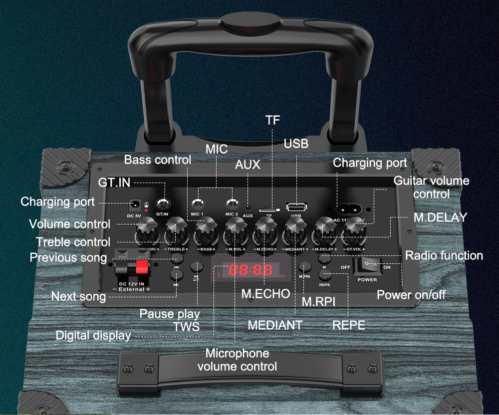 +带显示屏+USB带5V稳压/无锂电保护/电位器音量+带无线麦功能+XA8879D功放+高音/不带灯、对箱功能+蓝牙配对名:SY-SPEAKER