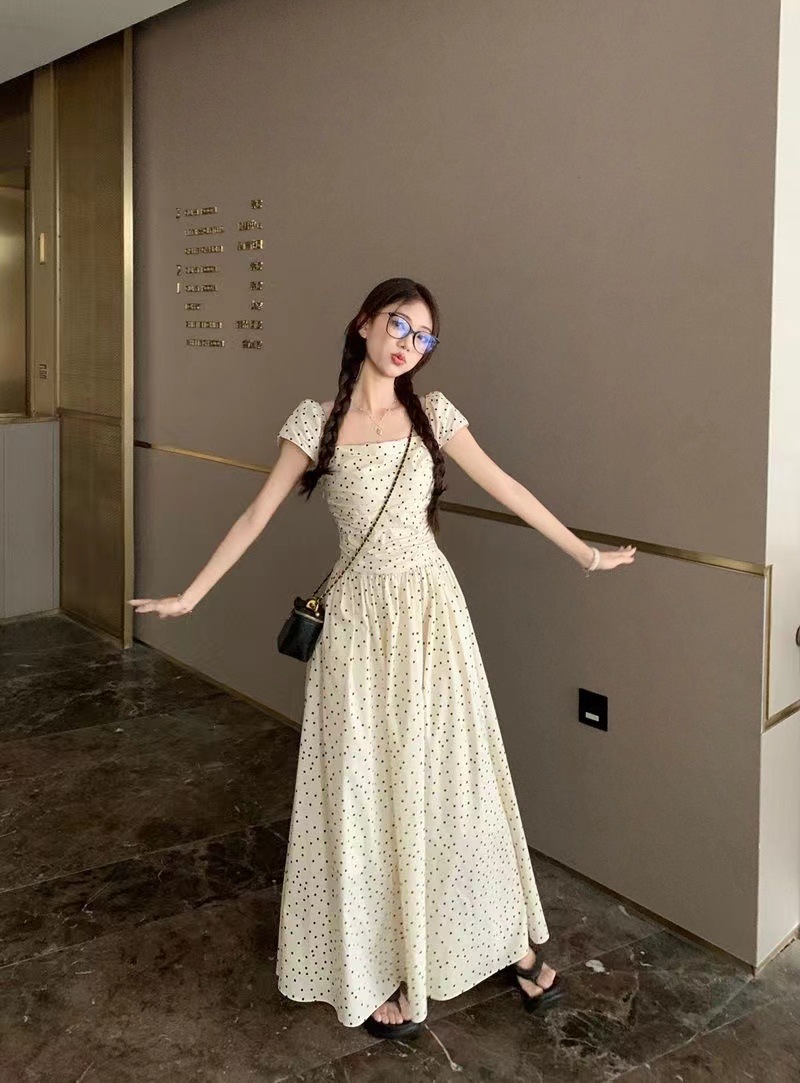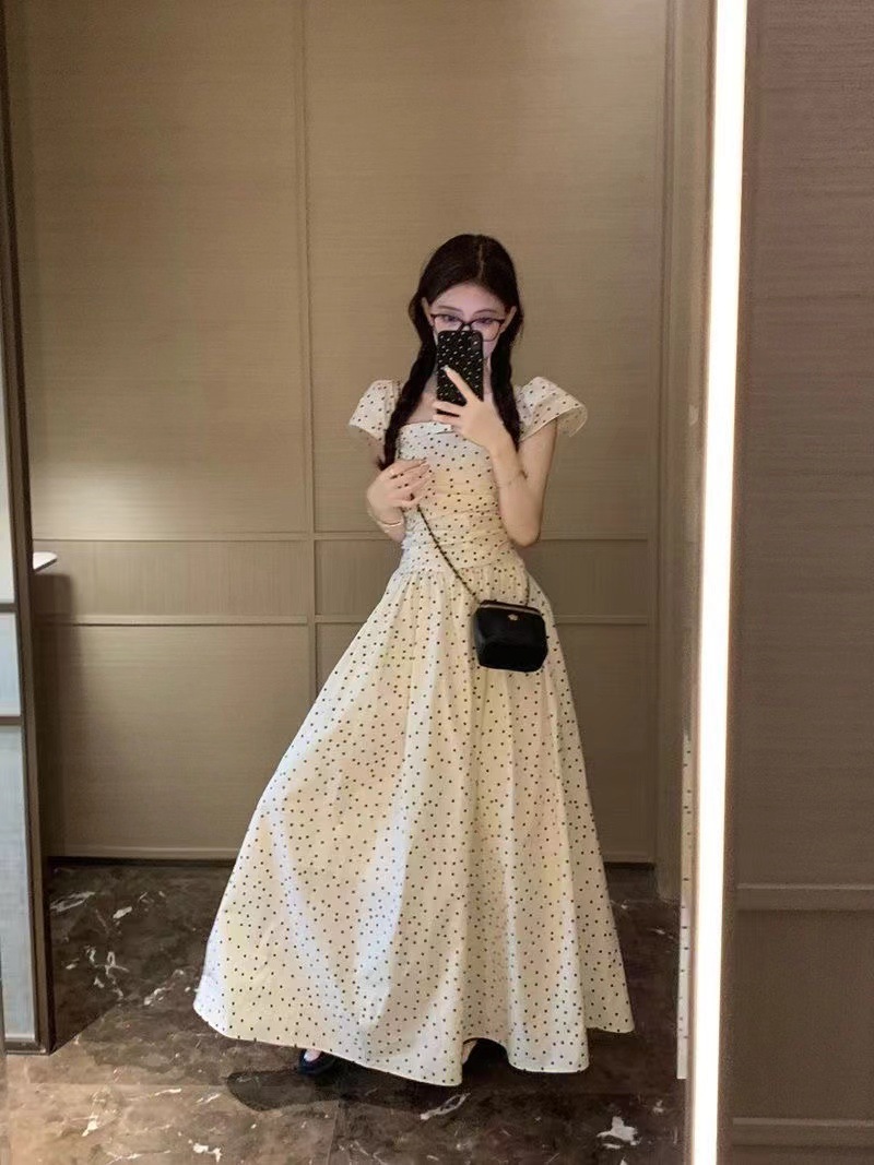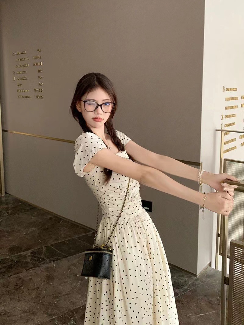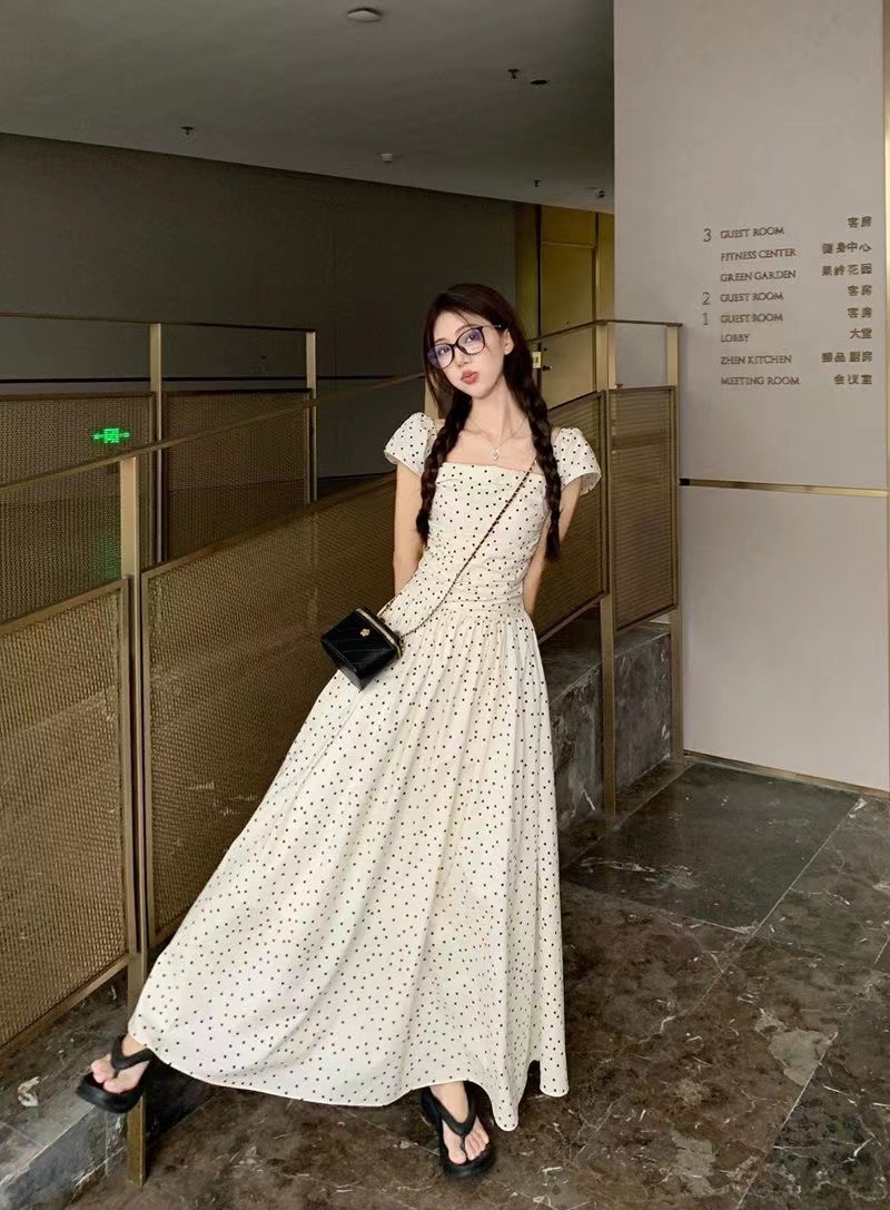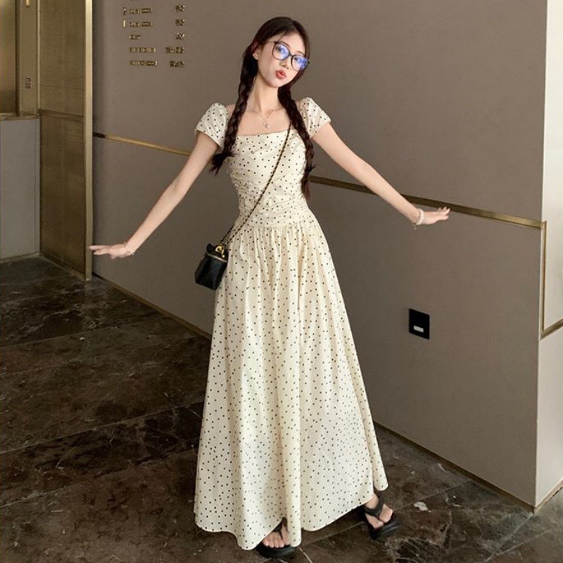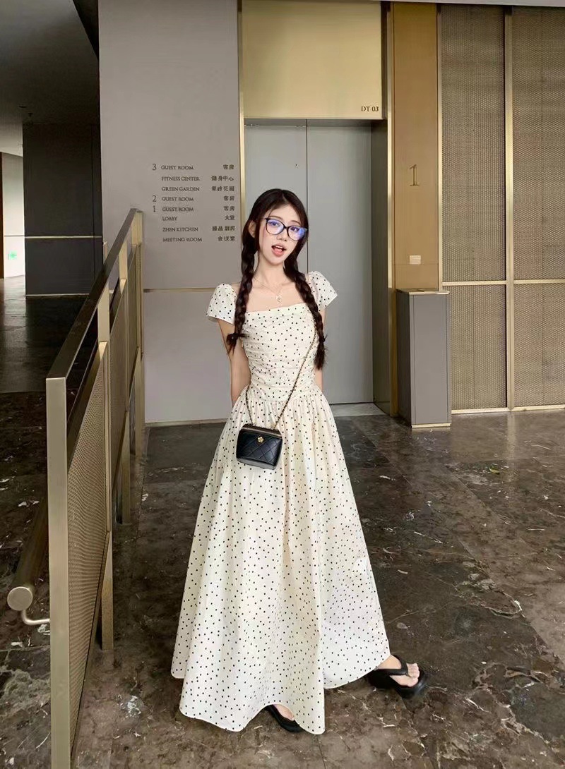 [내부] 프랑스 파 도트 버블 짧은 소매 원피스 여성 여름 스퀘어 칼라 허리 학생 원피스