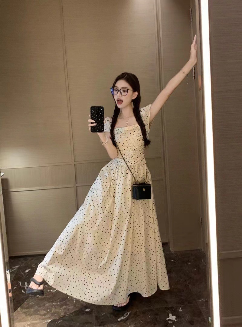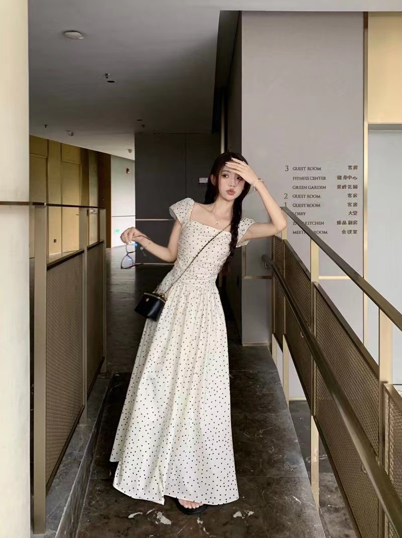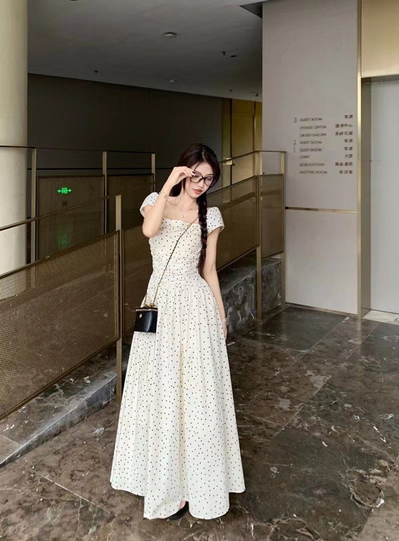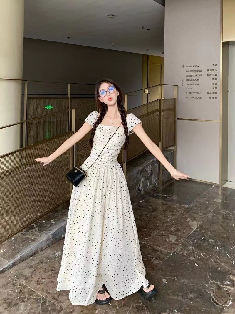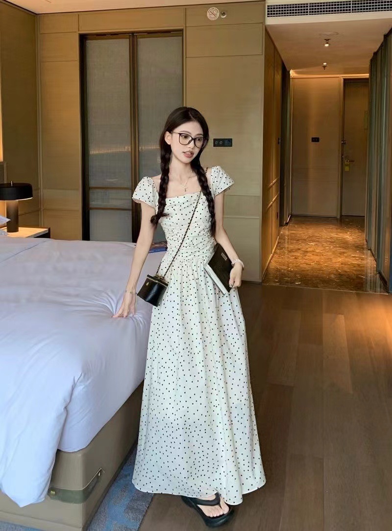 [내부] 프랑스 파 도트 버블 짧은 소매 원피스 여성 여름 스퀘어 칼라 허리 학생 원피스