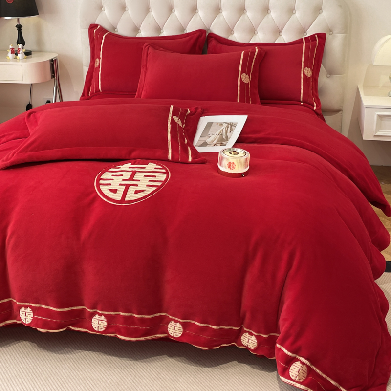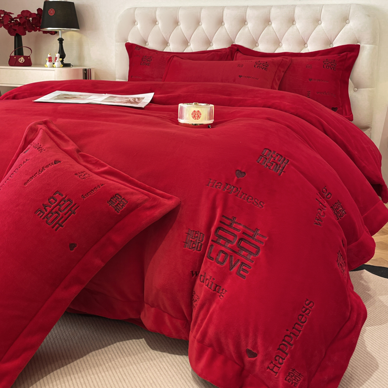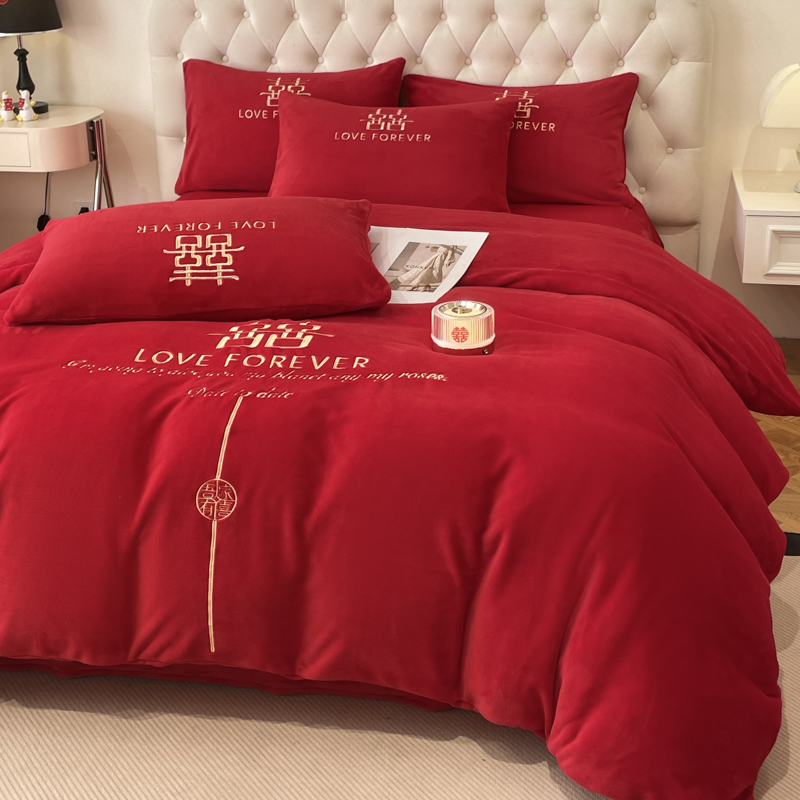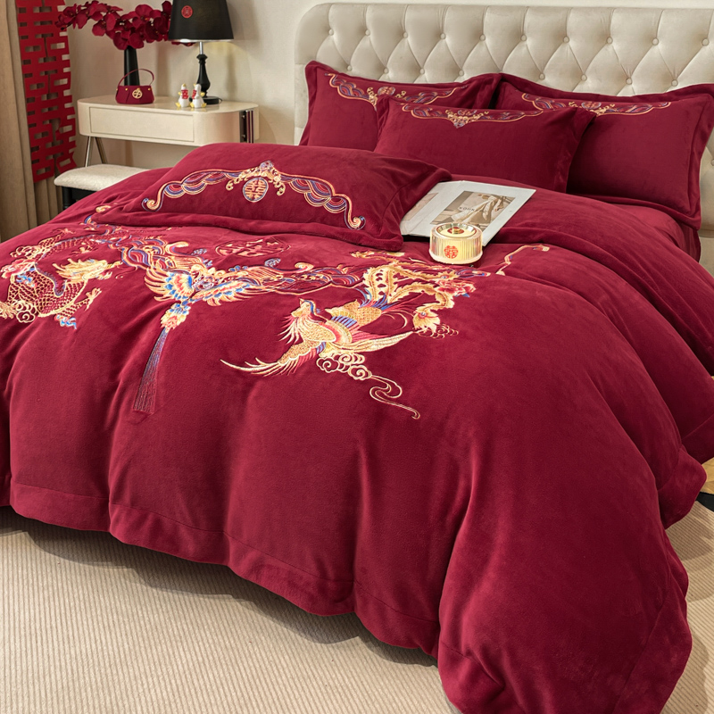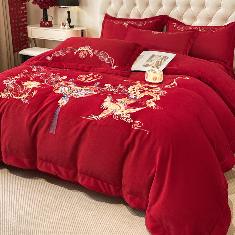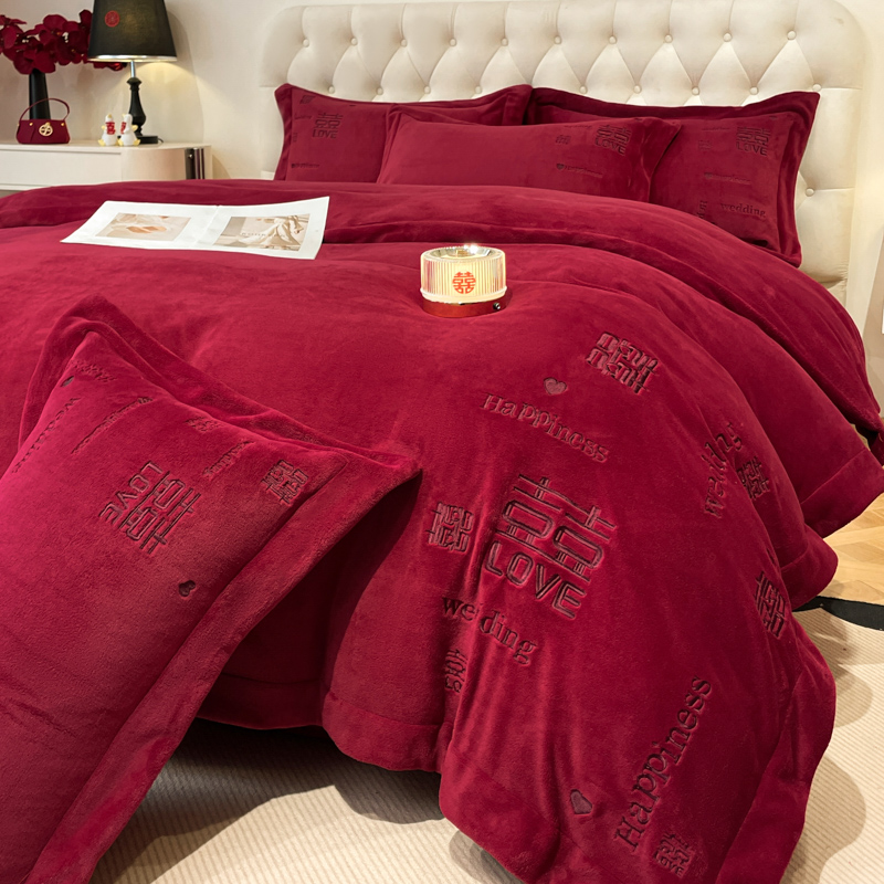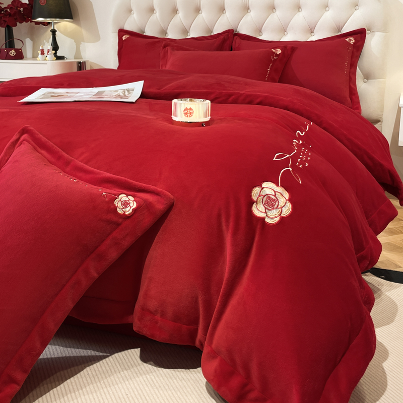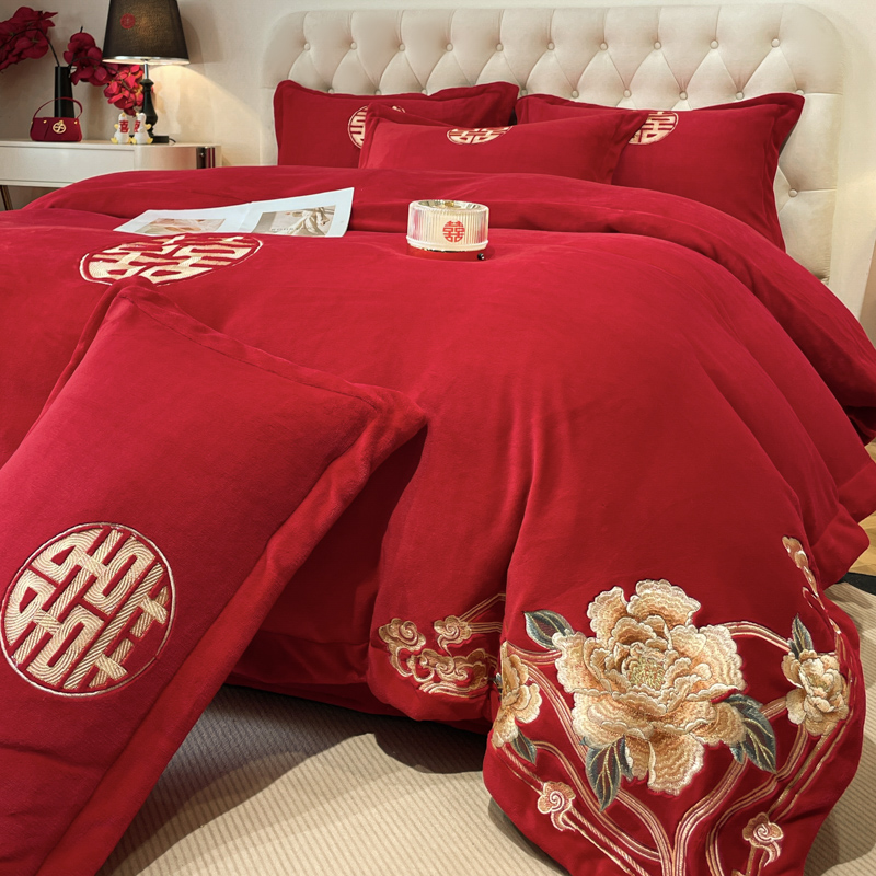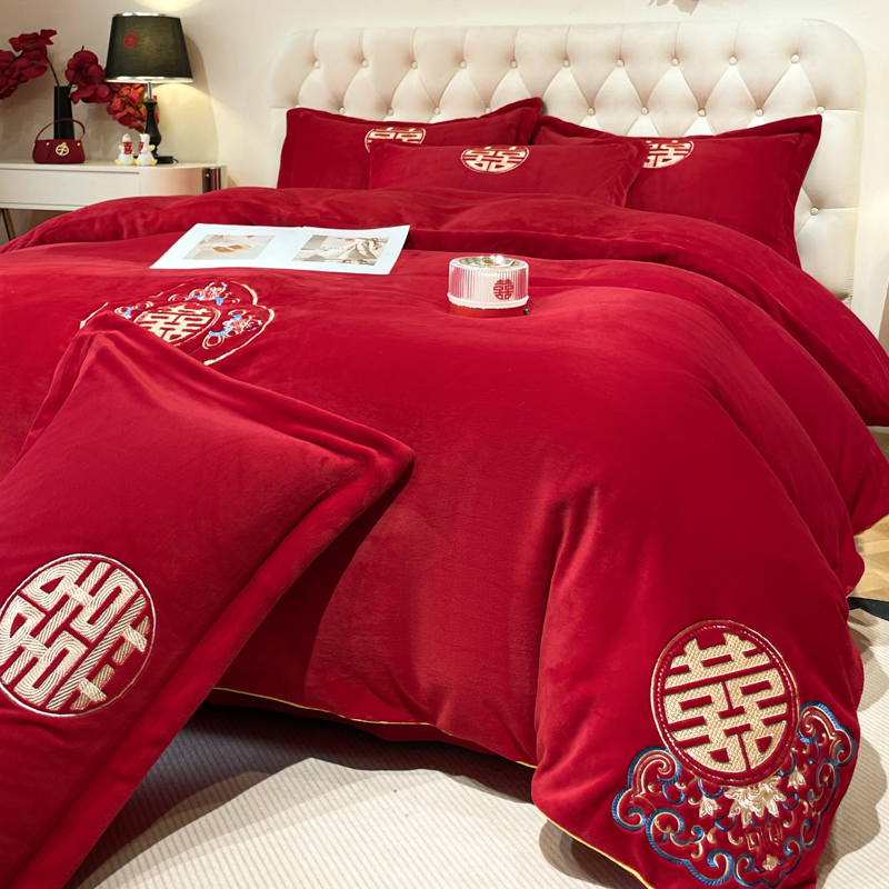 고급 중국 자수 우유 벨벳 침대 4 피스 큰 빨간 침대 시트 퀼트 커버 겨울 웨딩 웨딩 침구스토어 가기