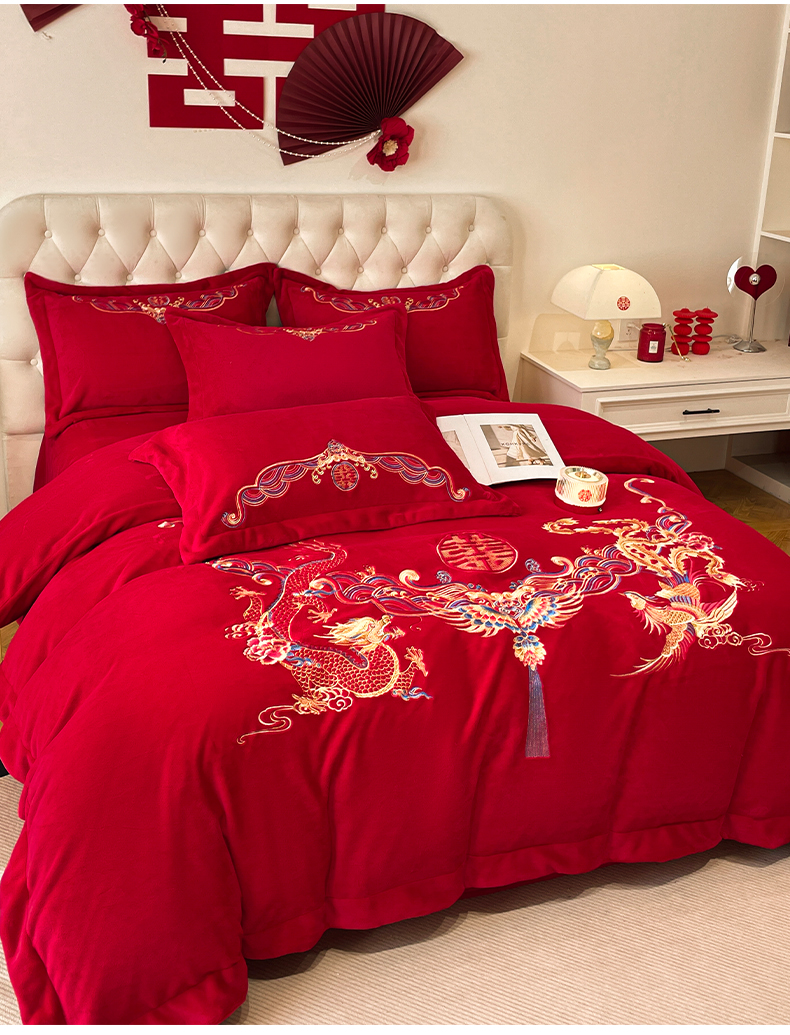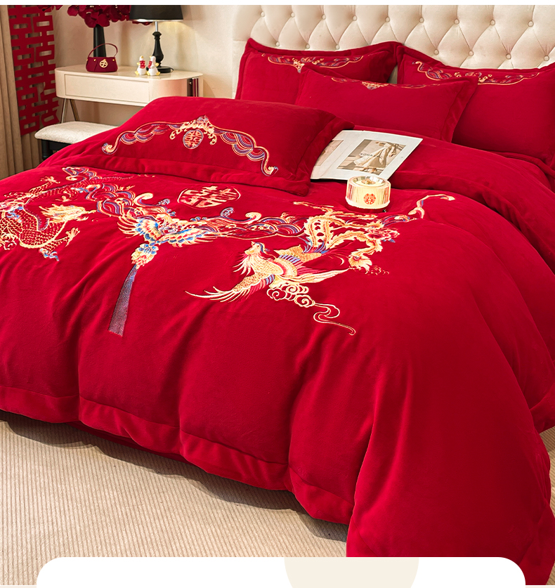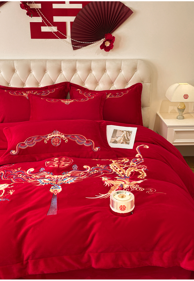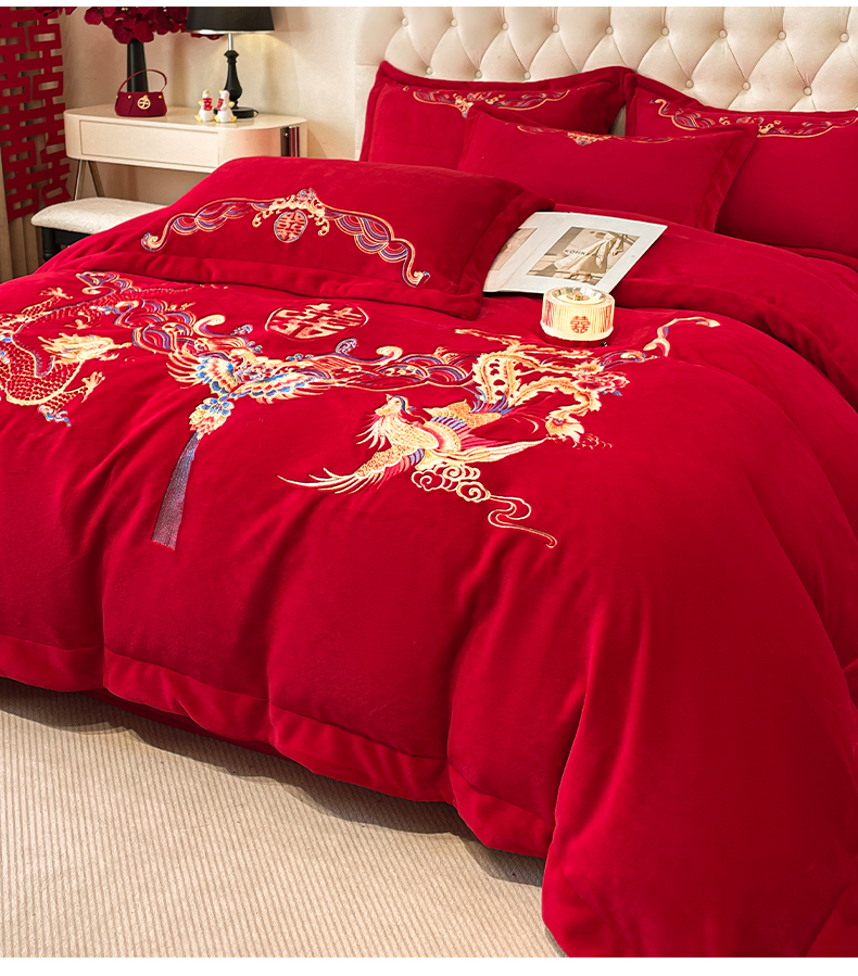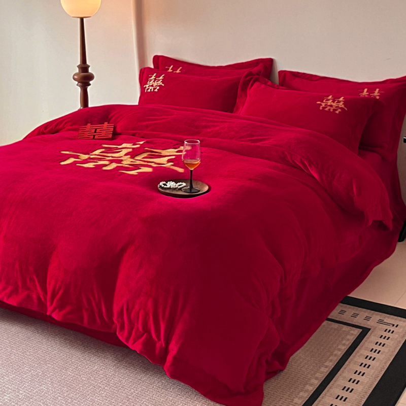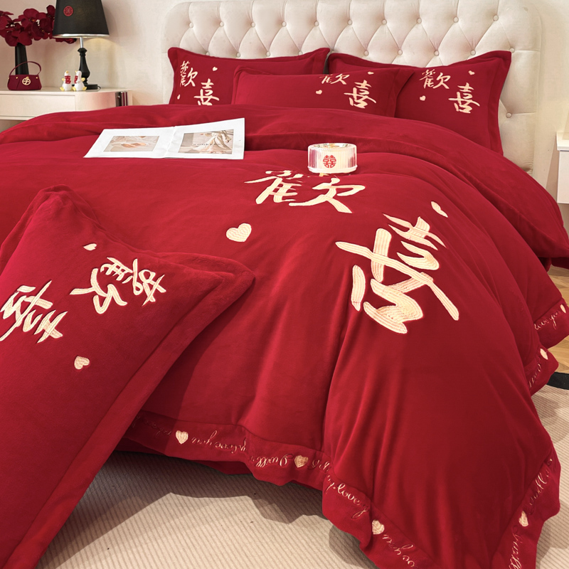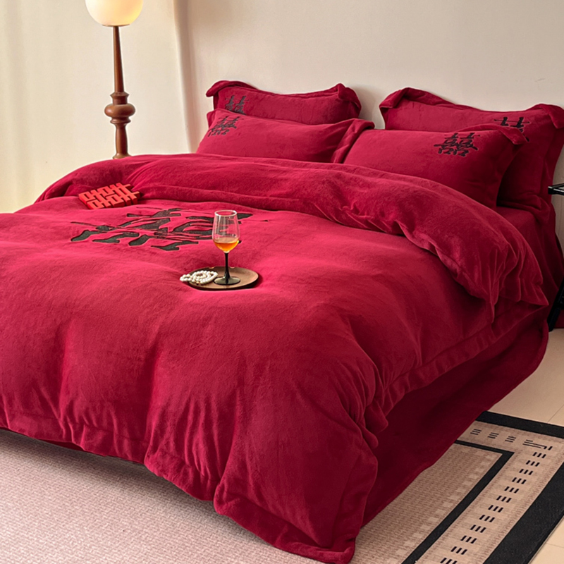 고급 중국 자수 우유 벨벳 침대 4 피스 큰 빨간 침대 시트 퀼트 커버 겨울 웨딩 웨딩 침구스토어 가기