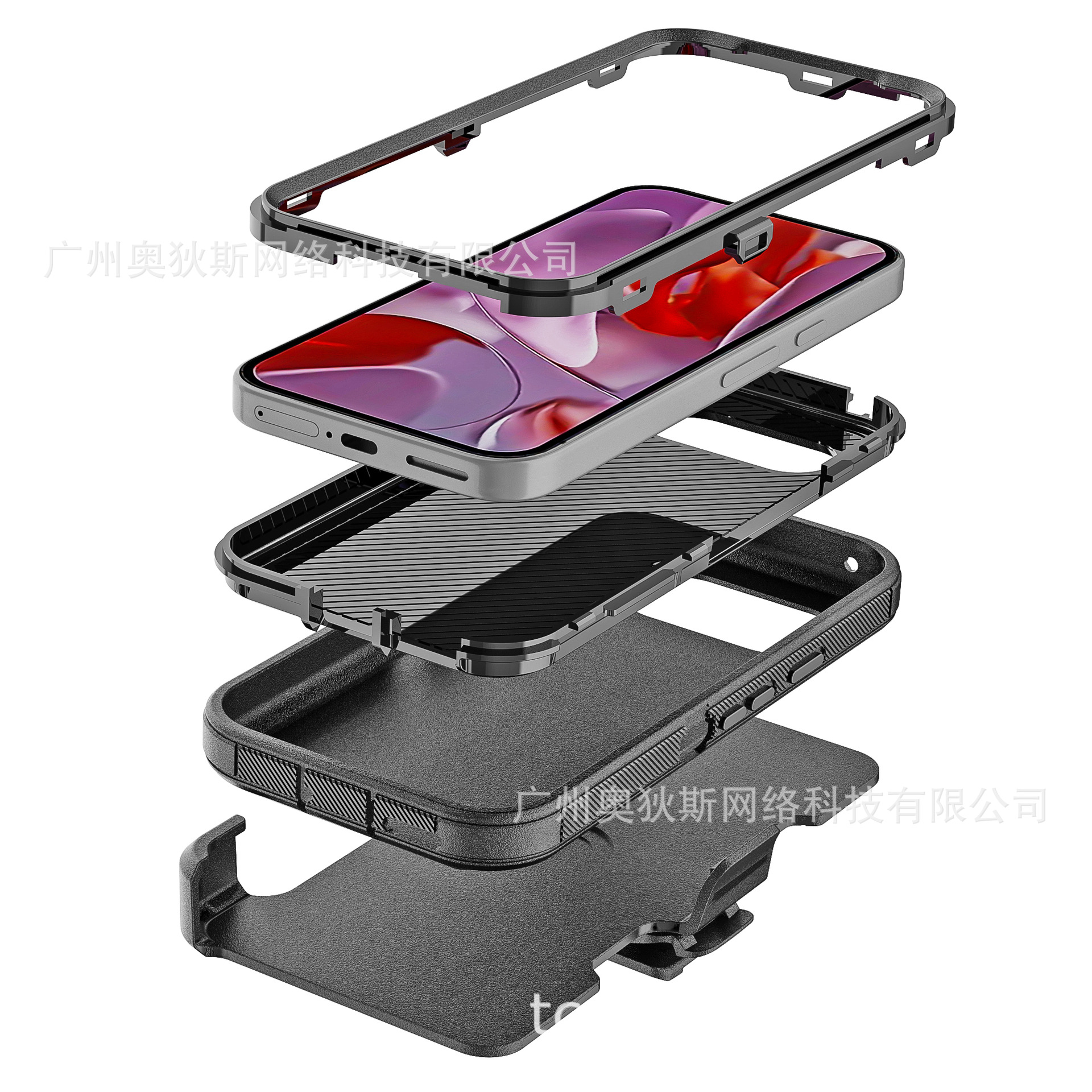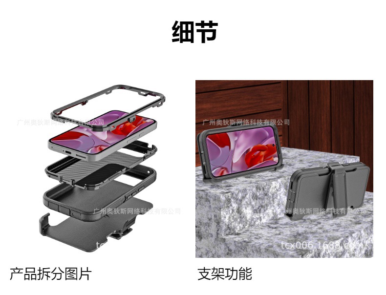 2.【设计构思】双层防护,三项材质结合,内层是由2个PC硬壳前后组成,可以的固定手机不容易松动,可以的屏幕不被划伤, 外层是TPU,在内层的保护之下,外层起到了一种缓冲作用.可以的过度的碰撞而损坏程度。