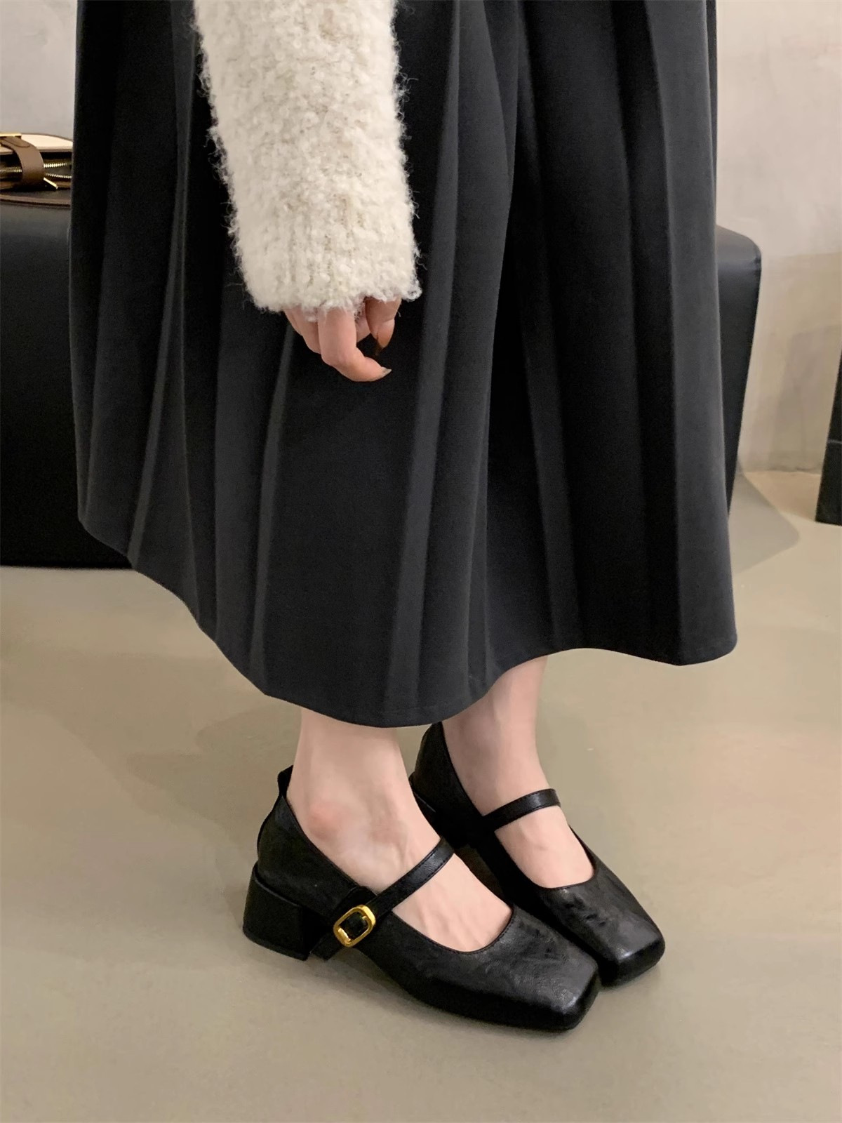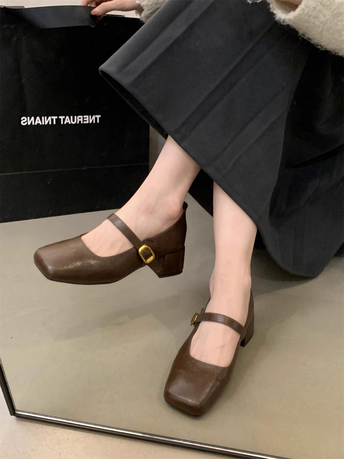 프랑스 레트로 스퀘어 발가락 얕은 입 싱글 레이어 신발 여성 미드 힐 봄과 가을 저녁 스타일 우아한 요정 두꺼운 힐 메리 제인 작은 가죽 신발스토어 가기