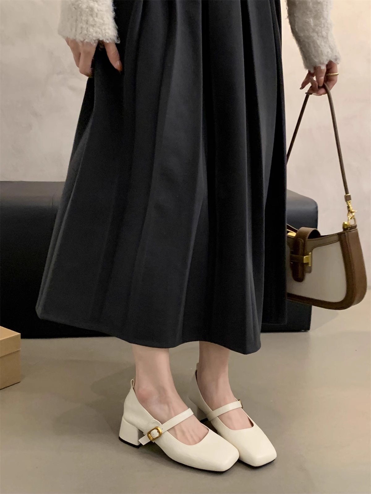 프랑스 레트로 스퀘어 발가락 얕은 입 싱글 레이어 신발 여성 미드 힐 봄과 가을 저녁 스타일 우아한 요정 두꺼운 힐 메리 제인 작은 가죽 신발