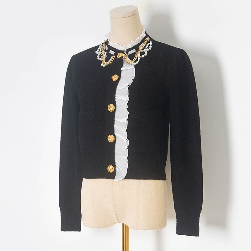 Z4249 초봄 신상 배색 러플 입체 비즈 체인 장식 더블 포켓 긴팔 니트 가디건 여성용