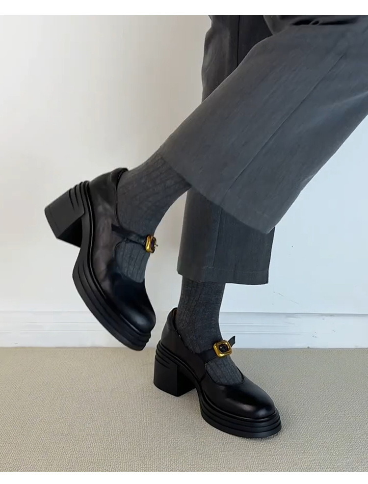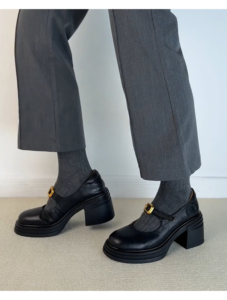 작은 통근 올매치 상승 된 Lefu 단일 레이어 신발 두꺼운 바닥과 둥근 발가락 여성 복고풍 작은 가죽 신발