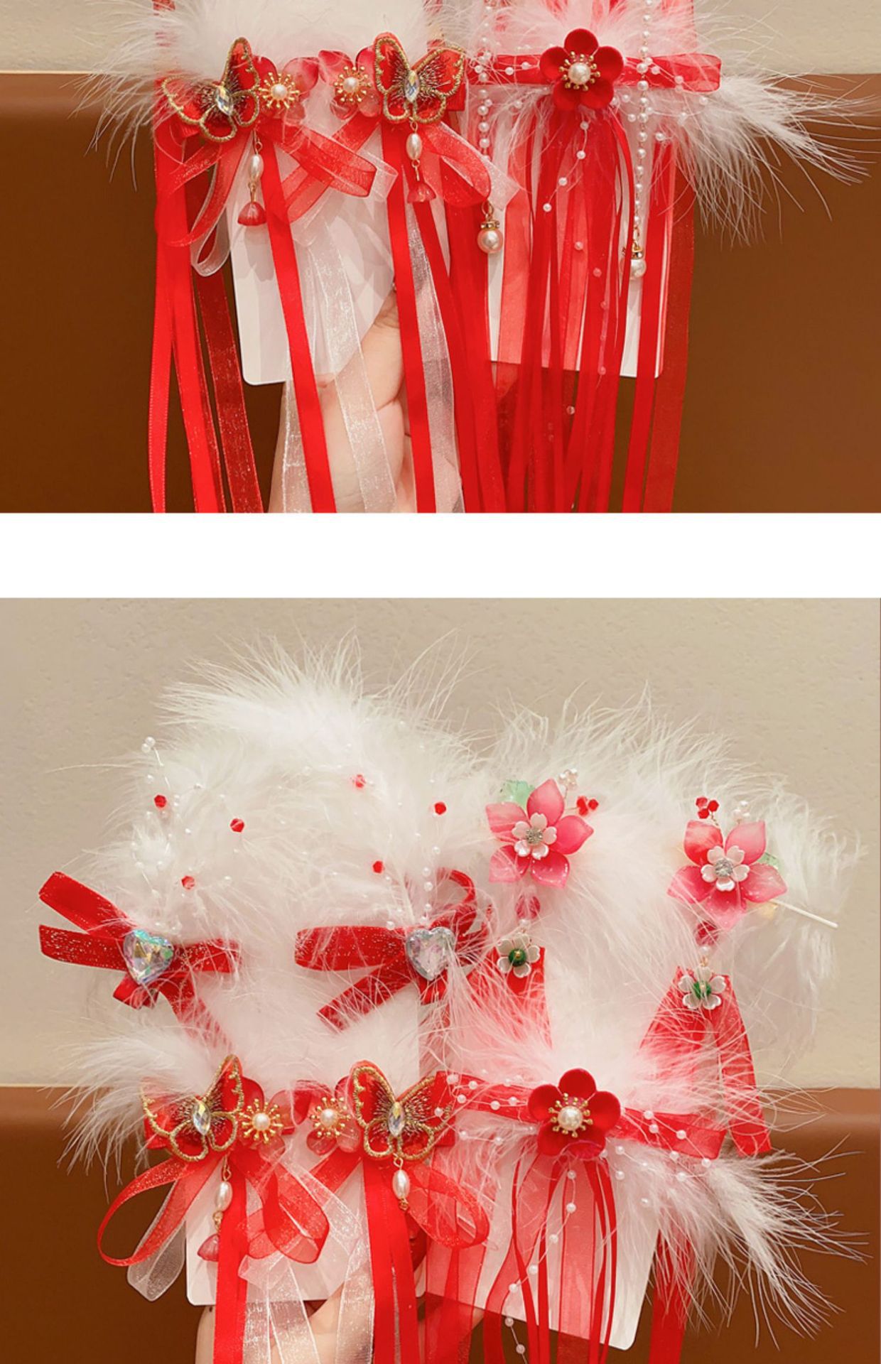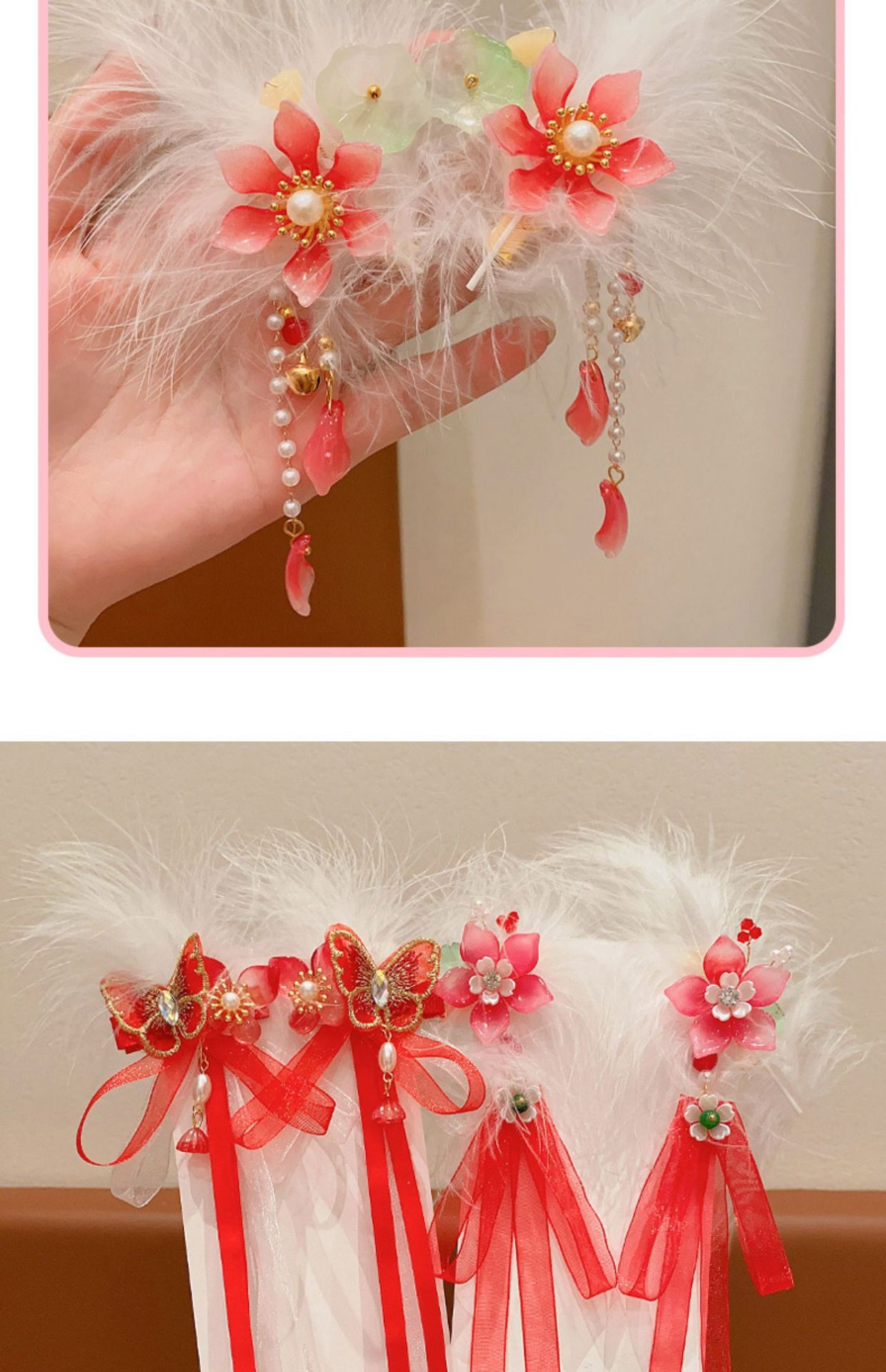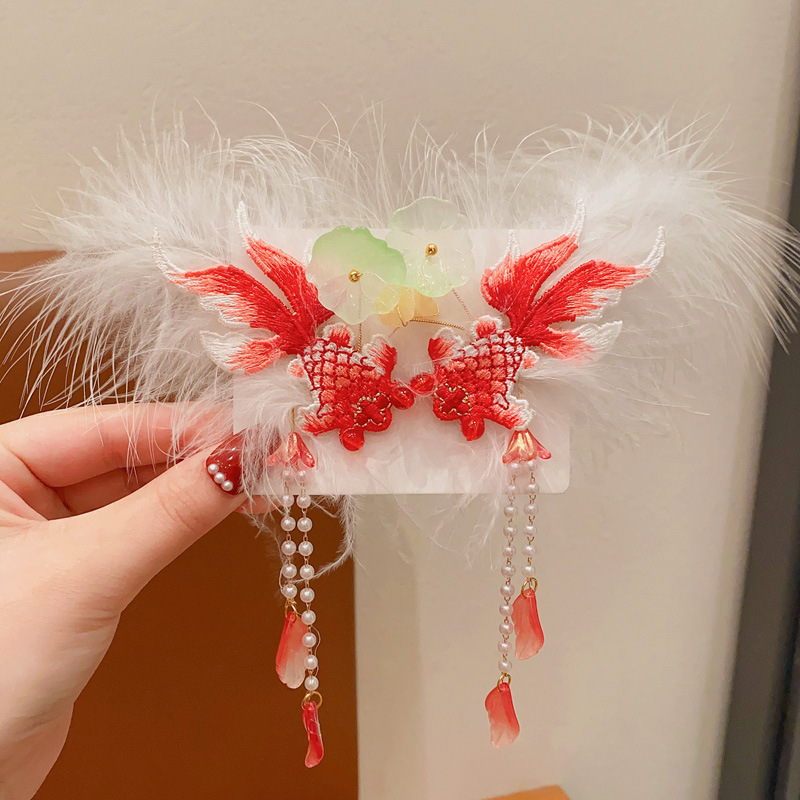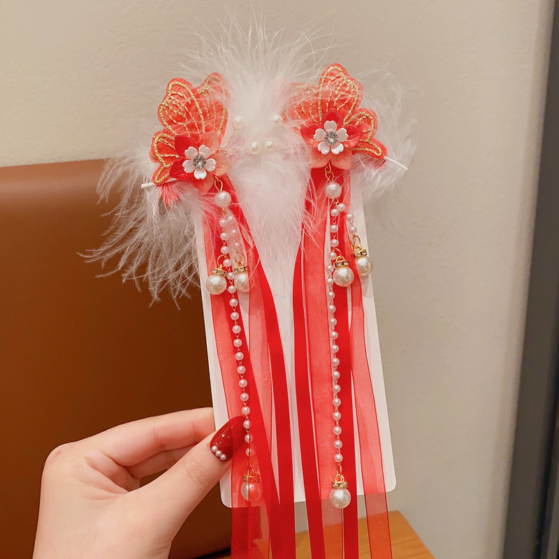 새해 어린이 머리핀 깃털 빨간 술 스트리밍 헤어 액세서리 축제 나비 머리핀 소녀 아기 헤드웨어