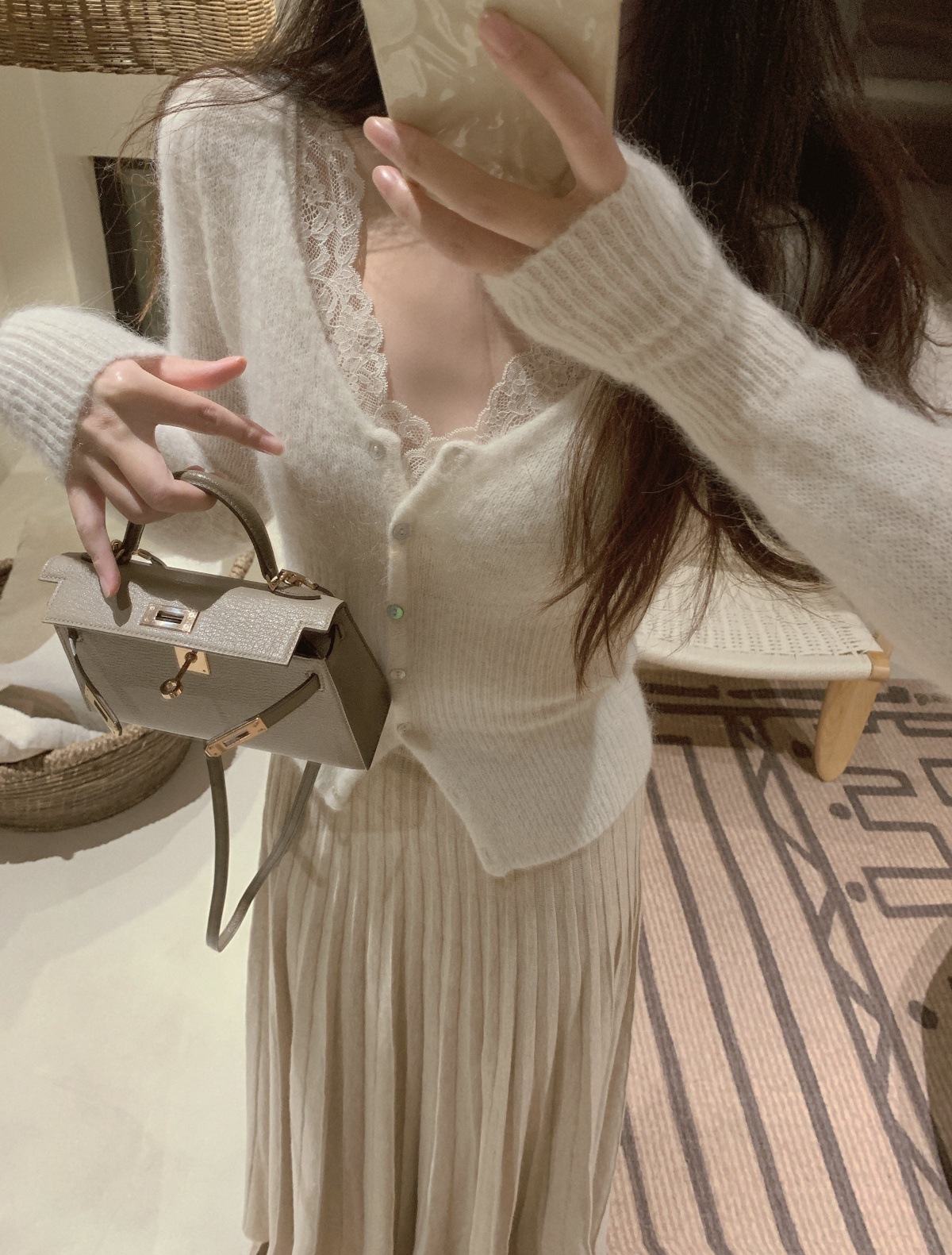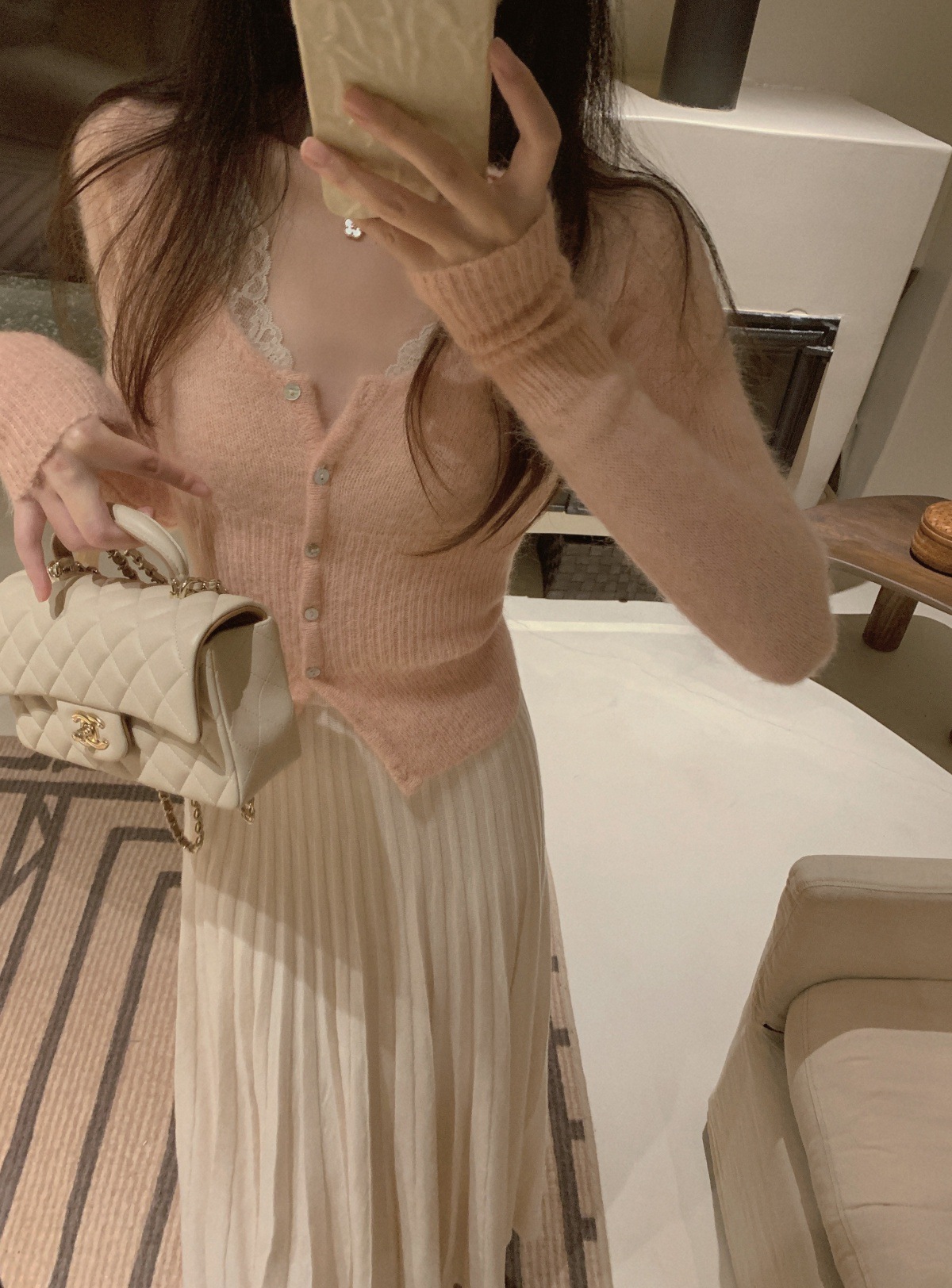 여성을위한 분위기 패브릭 페이크 투피스 레이스 스티칭 니트 탑 소프트 와시 알파카 V 넥 스웨터스토어 가기