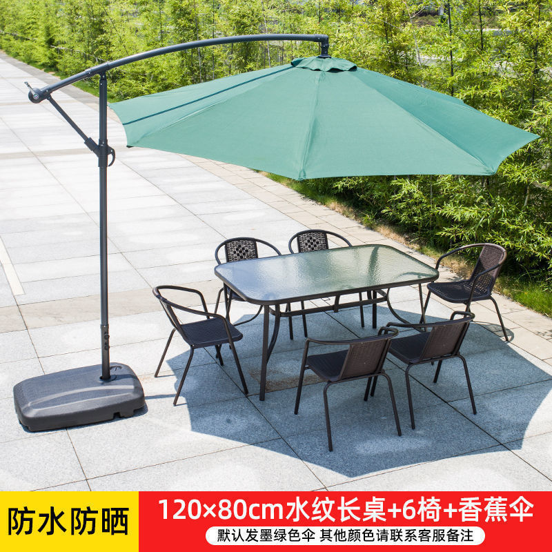 • 120x80 직사각형 테이블 + 의자 6개 + 이중 상단 중앙 기둥 우산