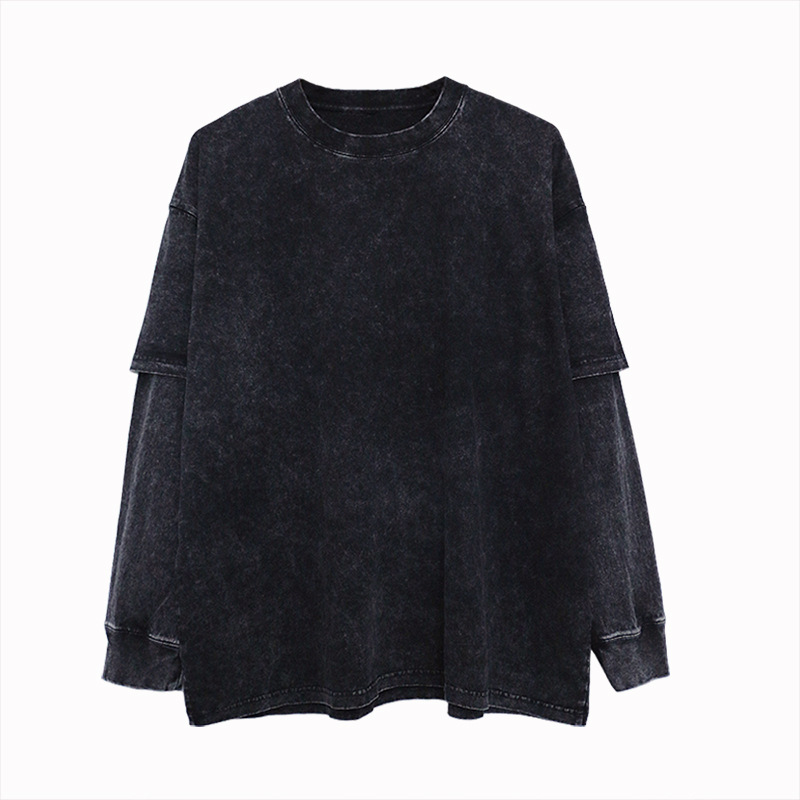 트렌디 한 브랜드 오버 사이즈 헤비 워시 올드 페이크 투피스 긴팔 티셔츠 남성용 세련된 미국식 하이 스트리트 보투 밍 탑스토어 가기