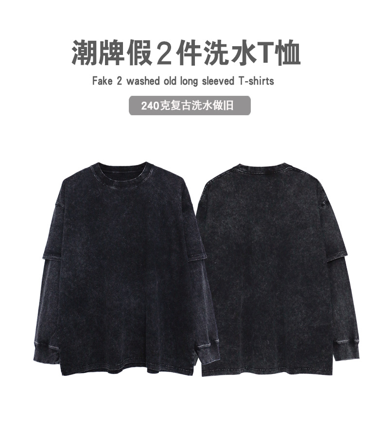 트렌디 한 브랜드 오버 사이즈 헤비 워시 올드 페이크 투피스 긴팔 티셔츠 남성용 세련된 미국식 하이 스트리트 보투 밍 탑