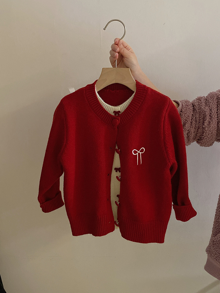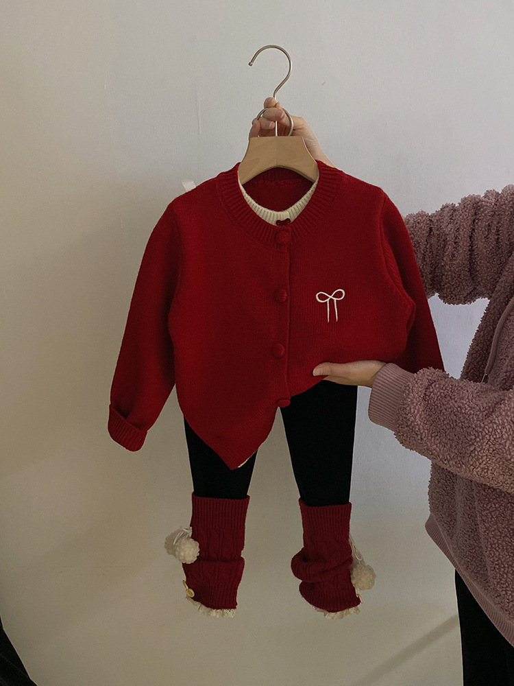 여자 한국 가을/겨울 세트 2024 여자 가짜 투피스 보우 스웨터 카디건 기모 스티칭 레깅스 트렌디