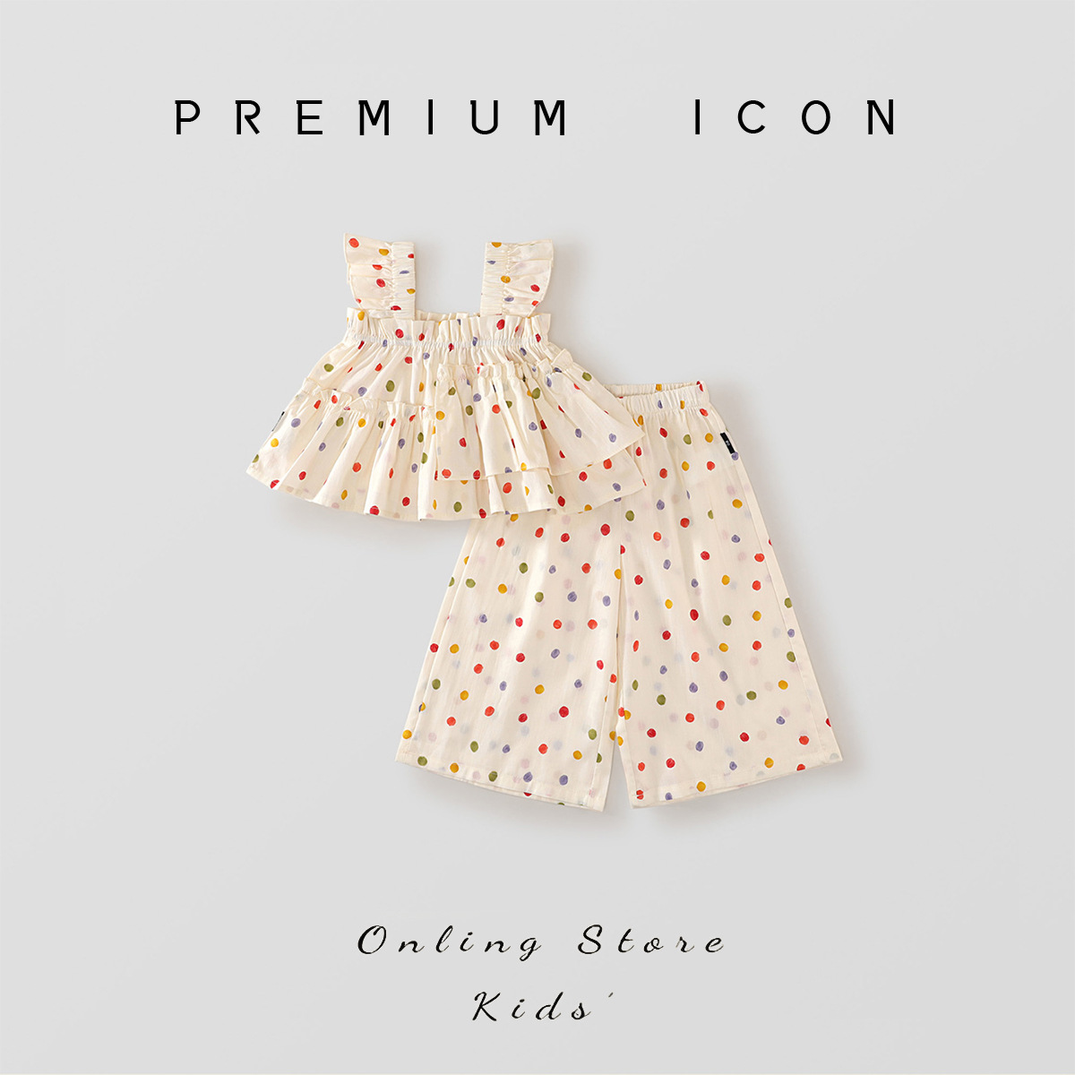 2025 년 봄 여름 소녀 컬러 웨이브 도트 세트 어린이 한국식 스위트 스타일 슬링 탑 와이드 레그 바지 투피스 세트