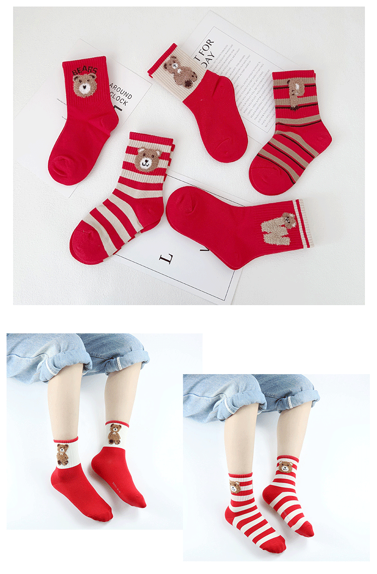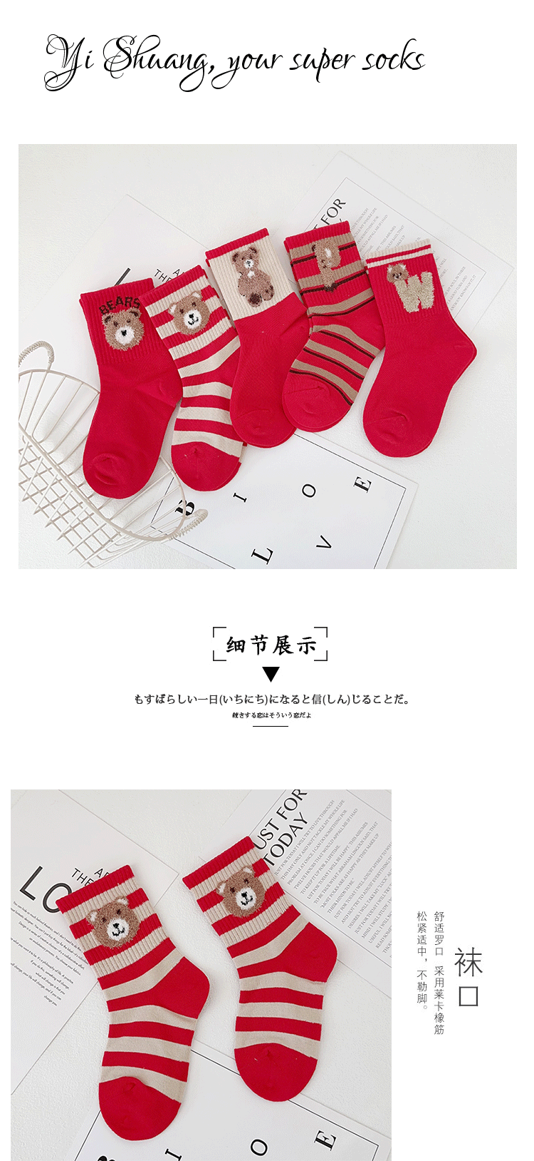 Yi Pair 어린이 양말 가을과 겨울 새로운 만화 곰 중간 양말 빗질 면 깃털 원사 붉은 새해 양말