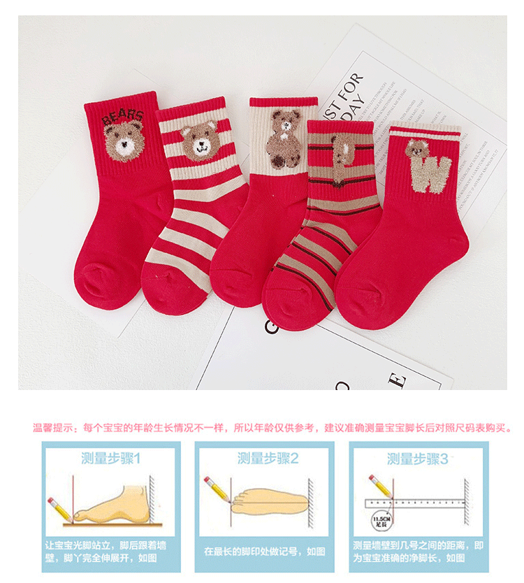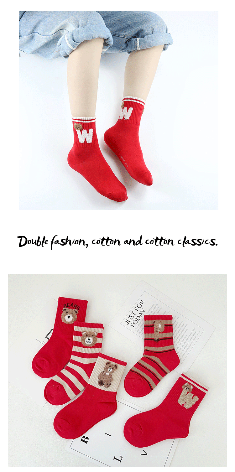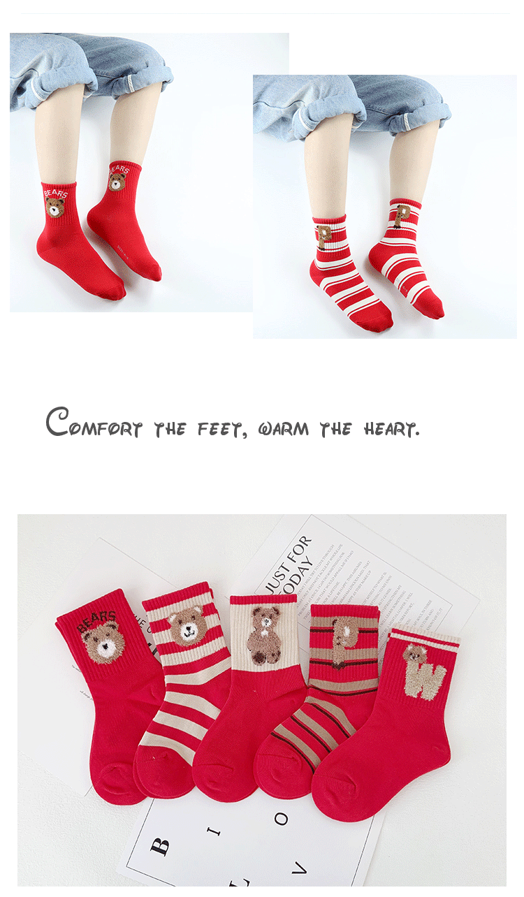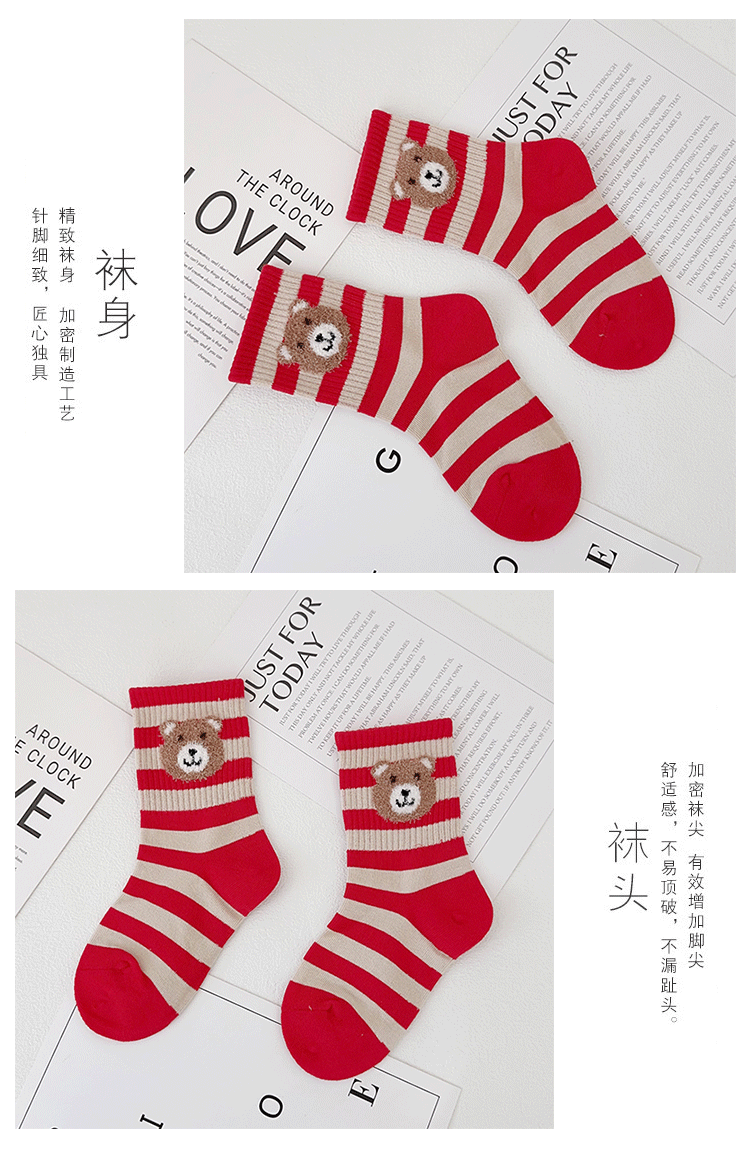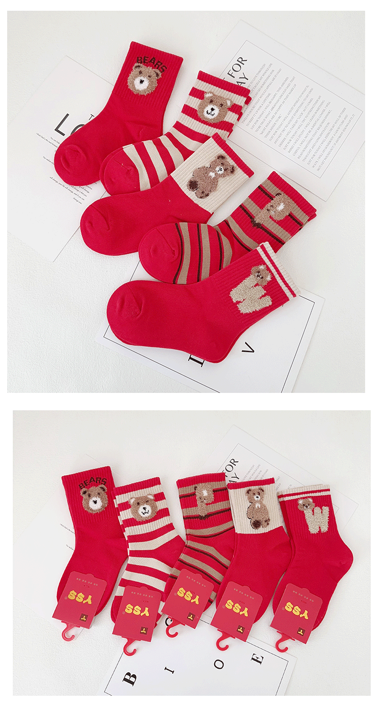 Yi Pair 어린이 양말 가을과 겨울 새로운 만화 곰 중간 양말 빗질 면 깃털 원사 붉은 새해 양말스토어 가기