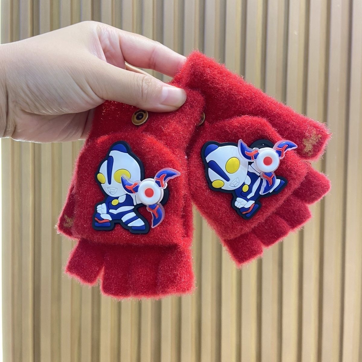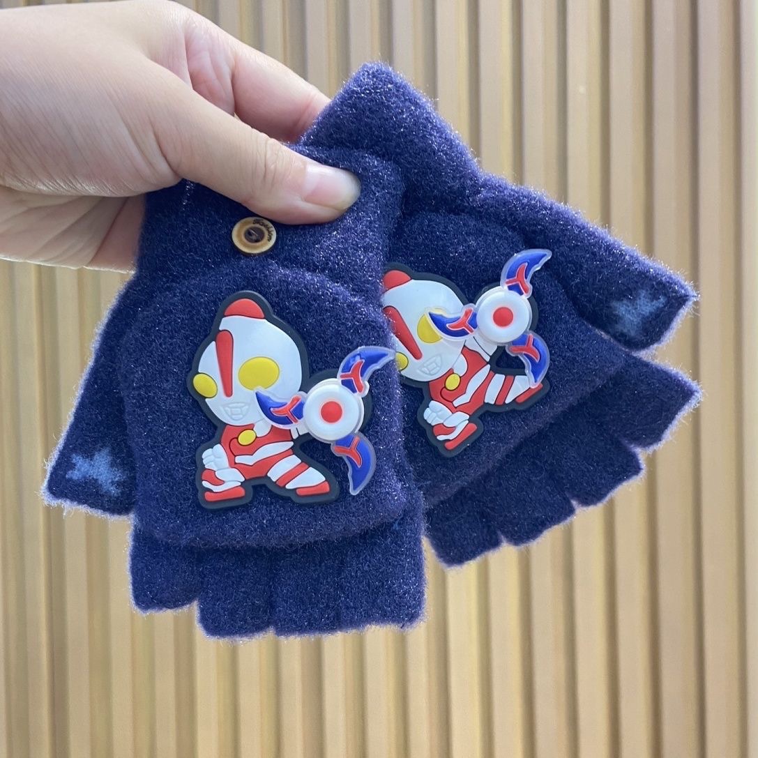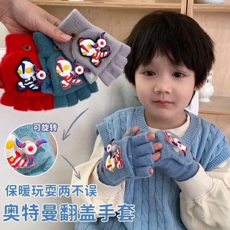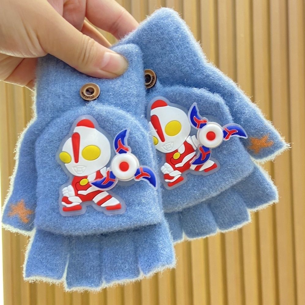 새로운 어린이 회전 울트라 맨 하프 핑거 장갑 울 니트 플립 커버 남자 손가락 누설 쓰기 겨울 두껍게