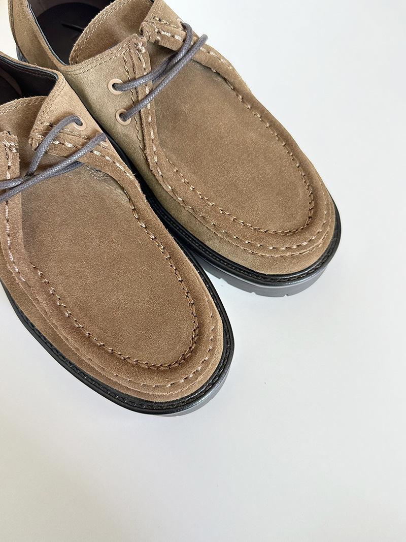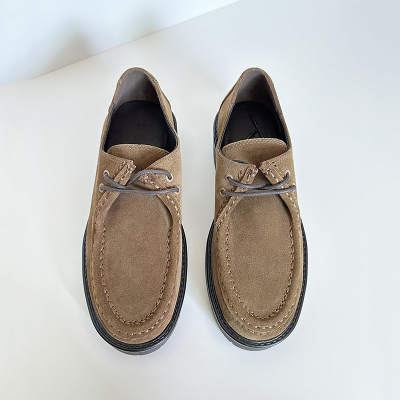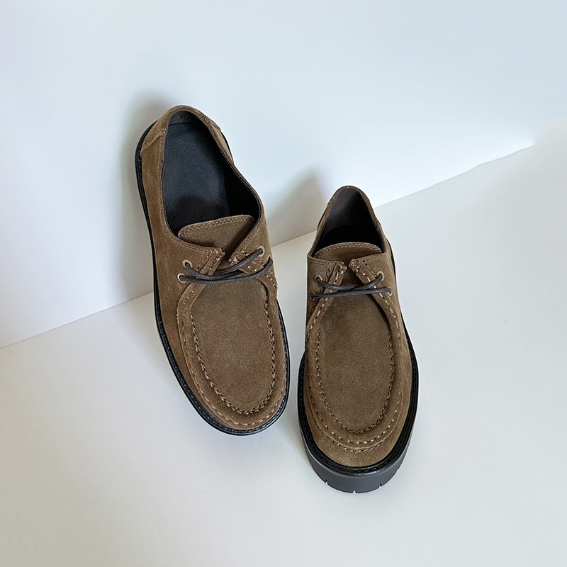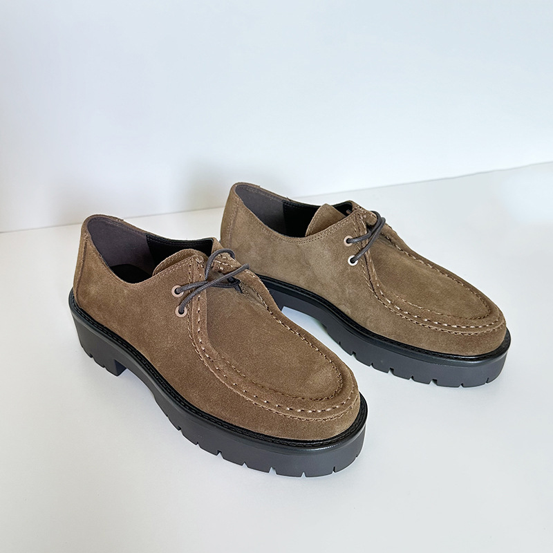 24 가을과 겨울 새로운 여성 신발 두꺼운 단독 영국 스타일 라운드 헤드 다크 브라운 소 벨벳 가죽 레이스 업 미드 힐 가죽 신발