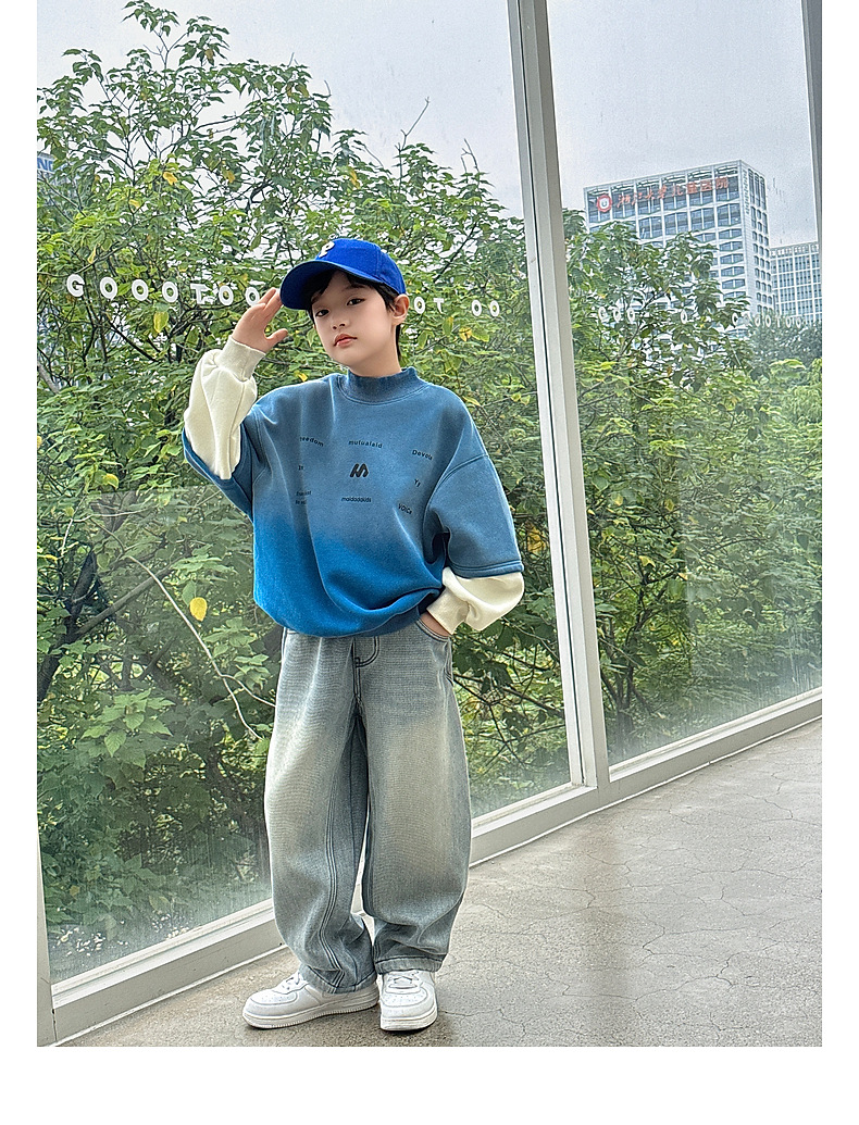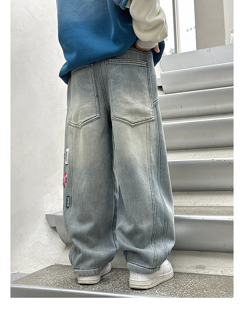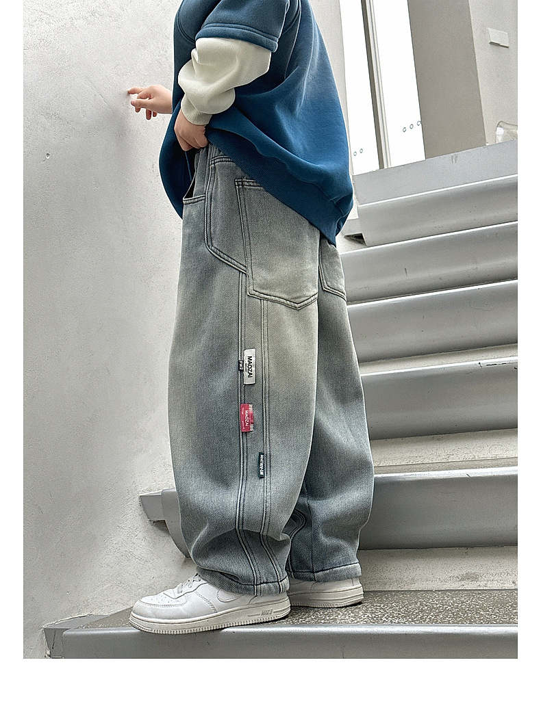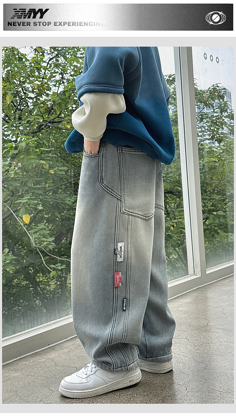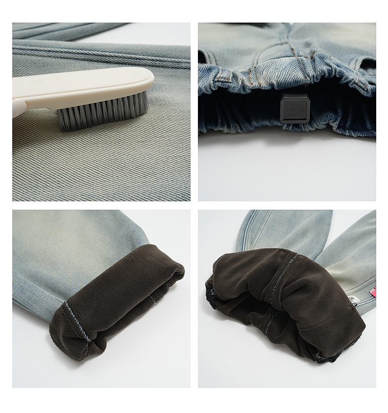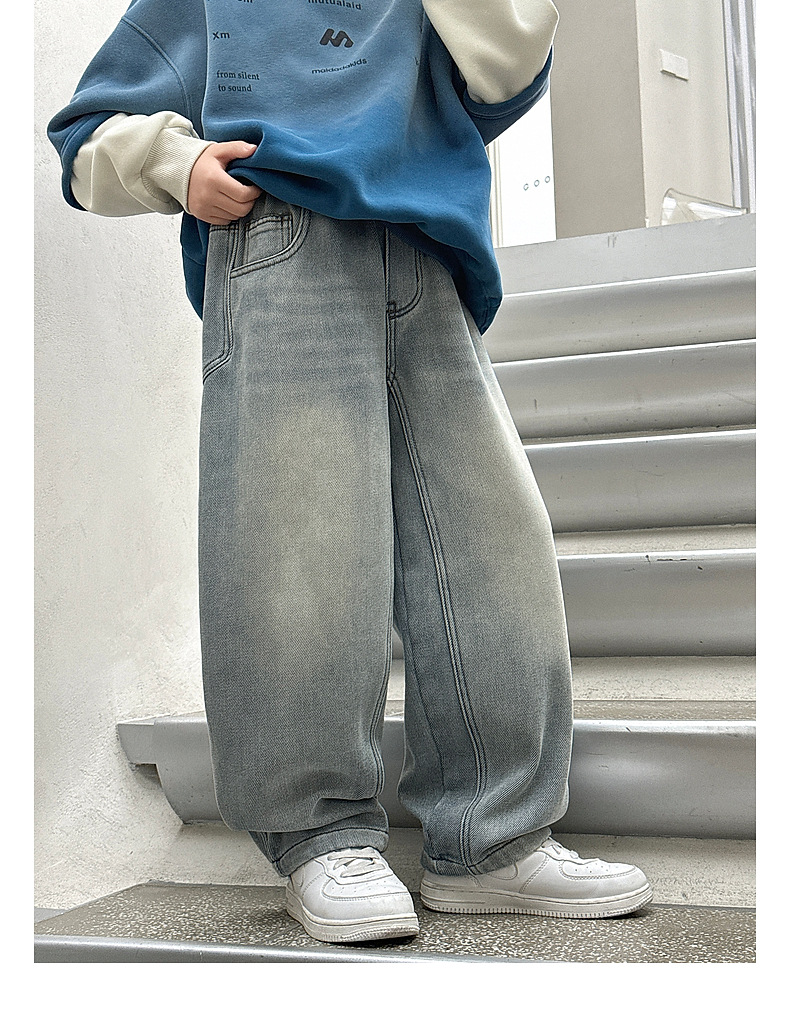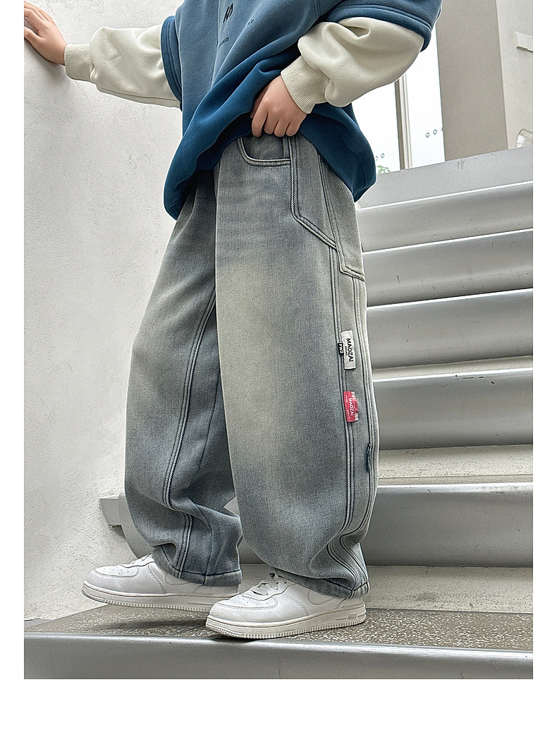팬더 원원 2025 겨울 신상품 올인원 플리스 남아용 청바지 남아용 플리스 바지 루즈핏 스트레이트 팬츠스토어 가기