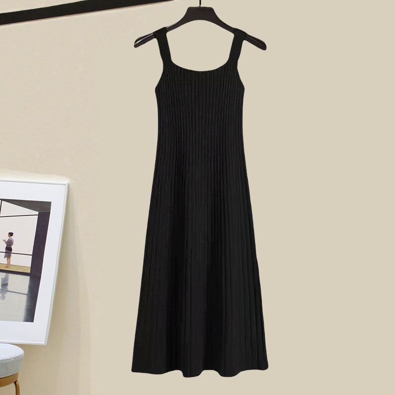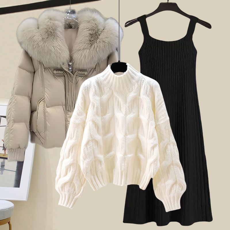 • 버튼 코튼 자켓 + 베이지 스웨터 + 블랙 원피스 3종 세트