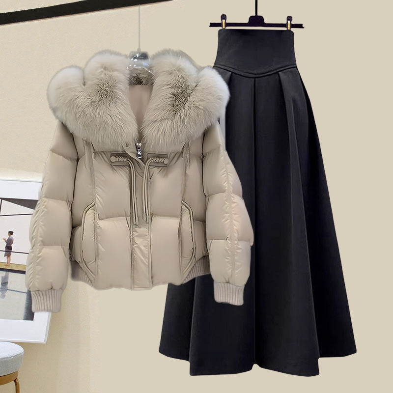 • 버튼 코튼 자켓 + 베이지 스웨터 + 블랙 스커트 3종 세트