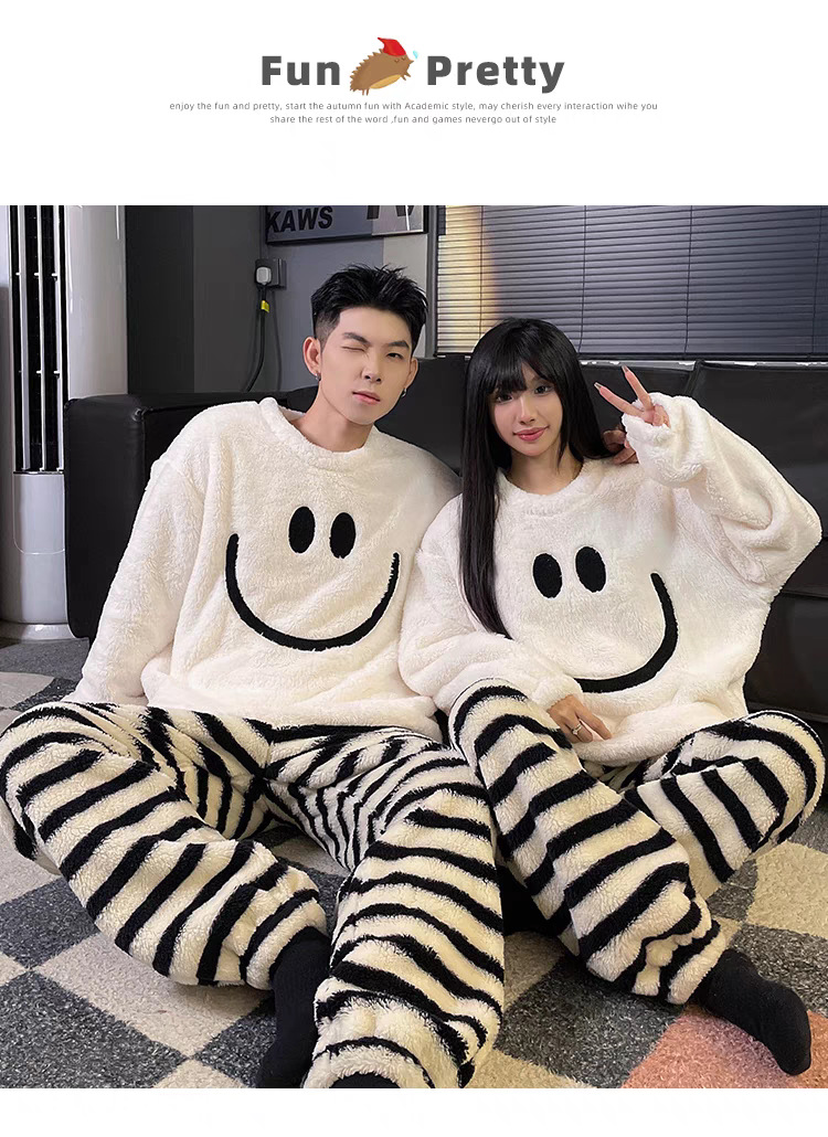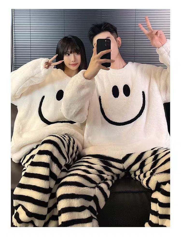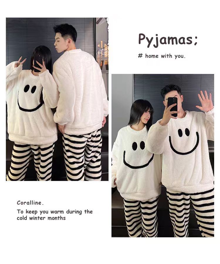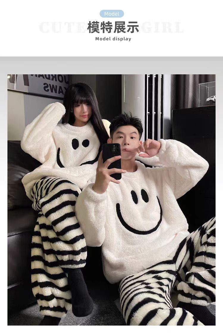겨울 커플 플란넬 새 스마일리 기모 두꺼운 파자마 여성용 긴팔 홈 의류 세트 남성용 홈 의류스토어 가기