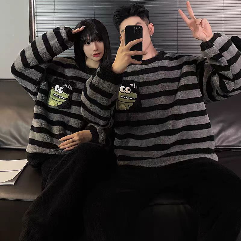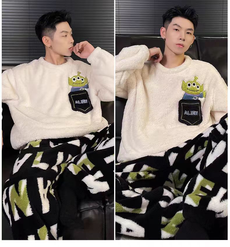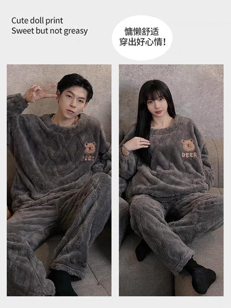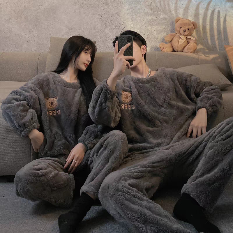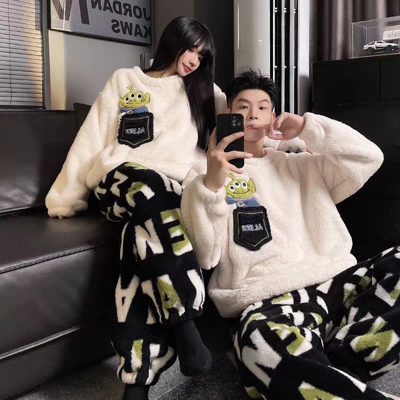 겨울 커플 플란넬 새 스마일리 기모 두꺼운 파자마 여성용 긴팔 홈 의류 세트 남성용 홈 의류스토어 가기
