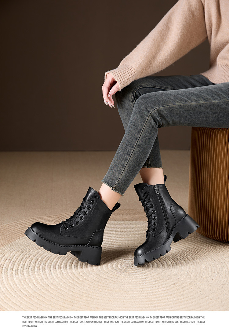 여성용 두꺼운 밑창 마틴 부츠 2024 새로운 가을 겨울 부츠 영국식 정품 가죽 하이힐 플러스 벨벳 짧은 부츠