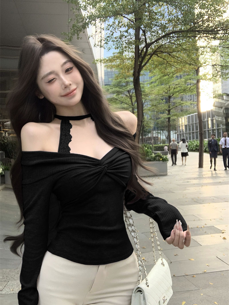 어깨 레이스 넥 긴팔 티셔츠 여성용 가을 슬림핏 핑크 디자인 짧은베이스 셔츠 퍼플 탑