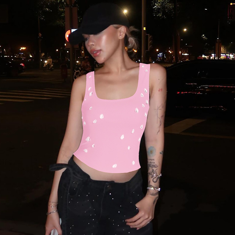 아마존 여성 의류 2025 여름 신작 패션 섹시 슬림 배꼽 노출 U 넥 조끼 구슬 장식 탑 도매
