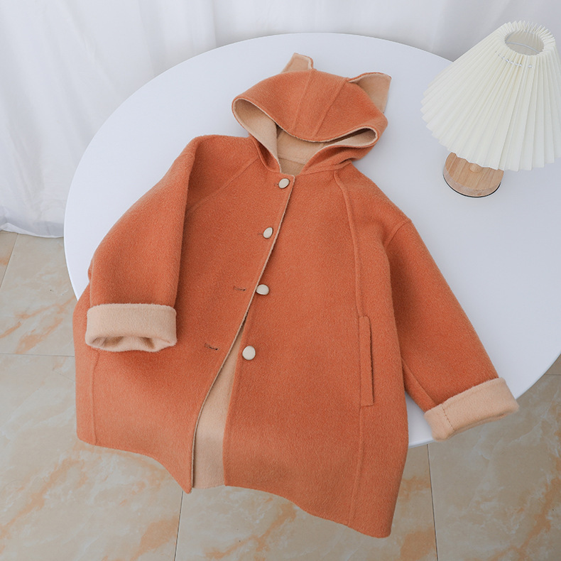 2025년 신상 양모 양면 코트 남아 여아 어린이 여우 귀 모양 모직 코트 겨울 중대형 어린이용