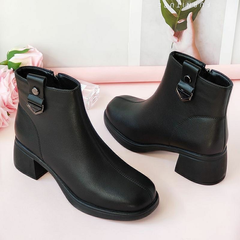 재고 두꺼운 뒤꿈치 기모 어머니 신발 우아한 조커 짧은 가죽 부츠 2024 가을 새로운 미끄럼 방지 피곤하지 않은 마틴 부츠