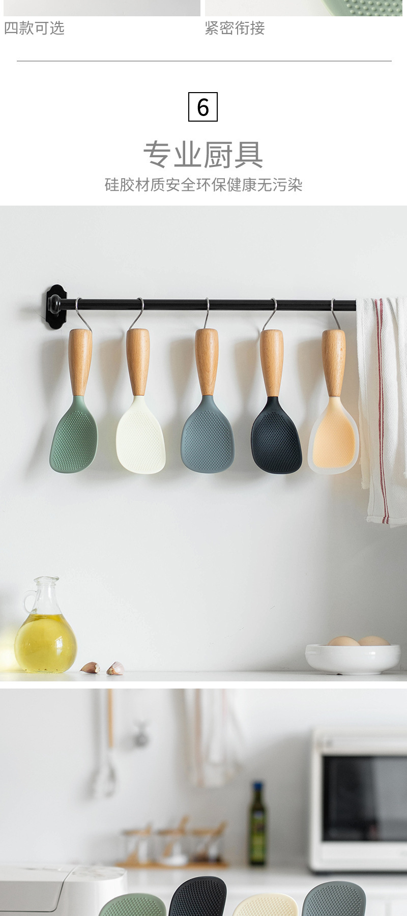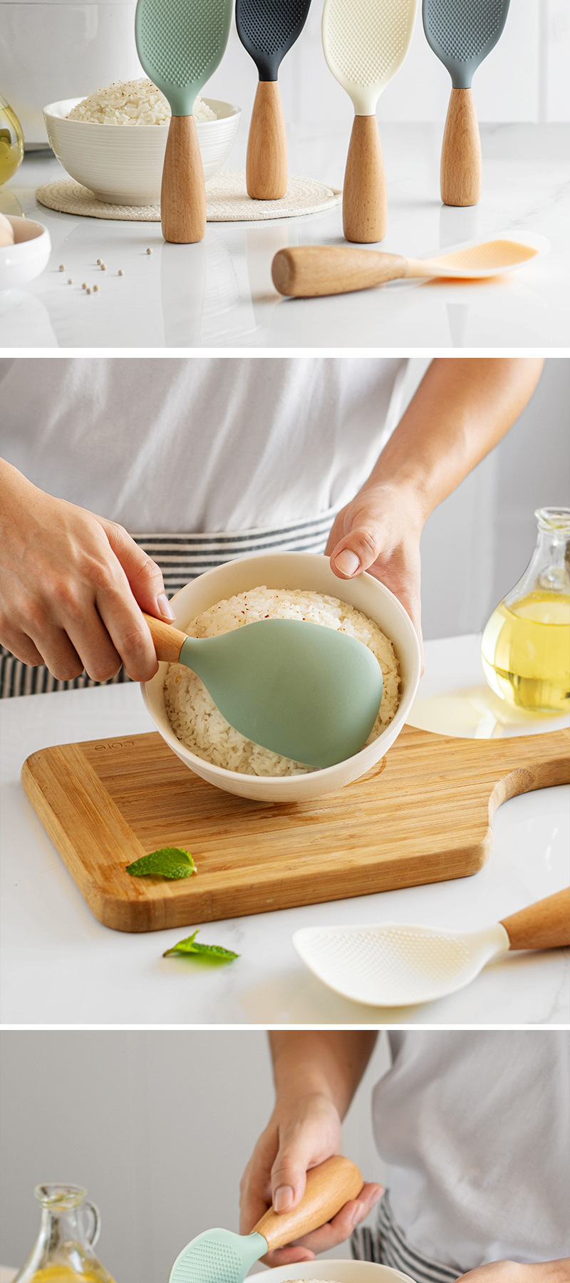 나무 손잡이 수직 실리콘 밥숟가락, 긁힘 방지 밥솥 라이너, 붙지 않는 밥숟가락, 가정용 스탠드업 밥숟가락스토어 가기