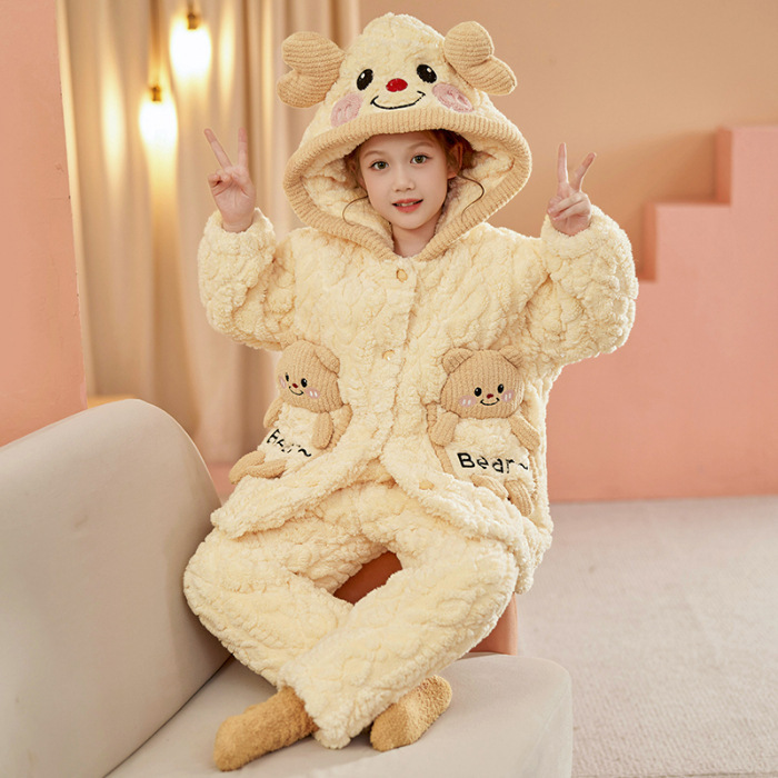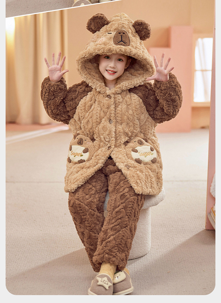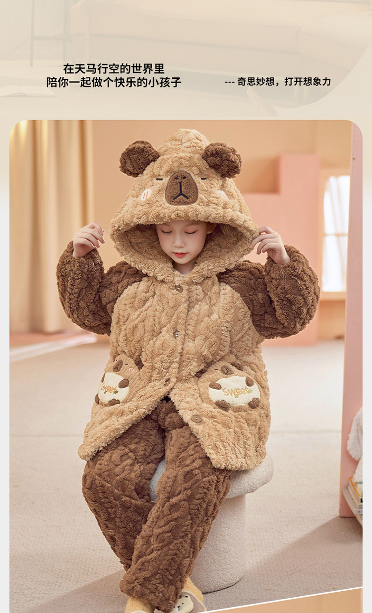 만화 카드 피발라 소녀 3 층 퀼트 파자마 겨울 후드 기모 두꺼운 중대형 어린이 가정 옷 세트
