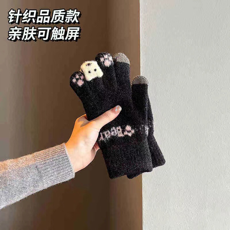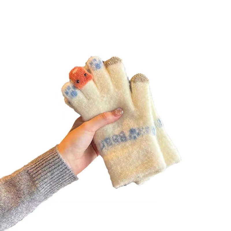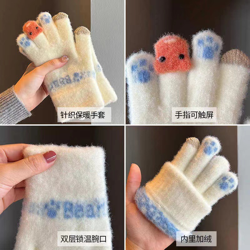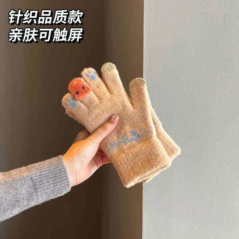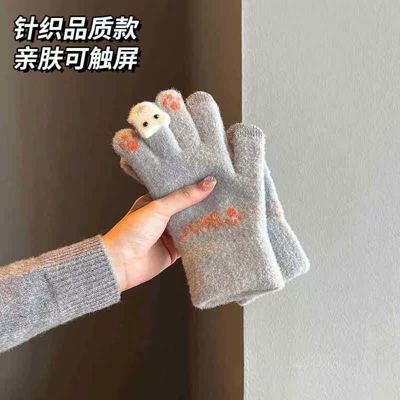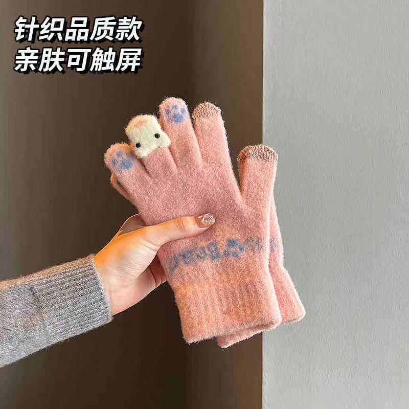귀여운 봉제 장갑 여성의 겨울 두꺼운 따뜻한 터치 스크린 니트 양모 사이클링 방한 손가락 겨울스토어 가기