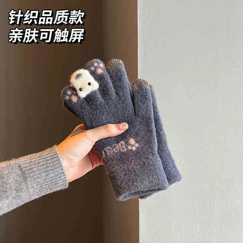 귀여운 봉제 장갑 여성의 겨울 두꺼운 따뜻한 터치 스크린 니트 양모 사이클링 방한 손가락 겨울