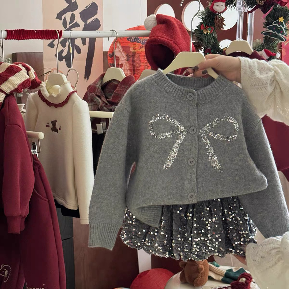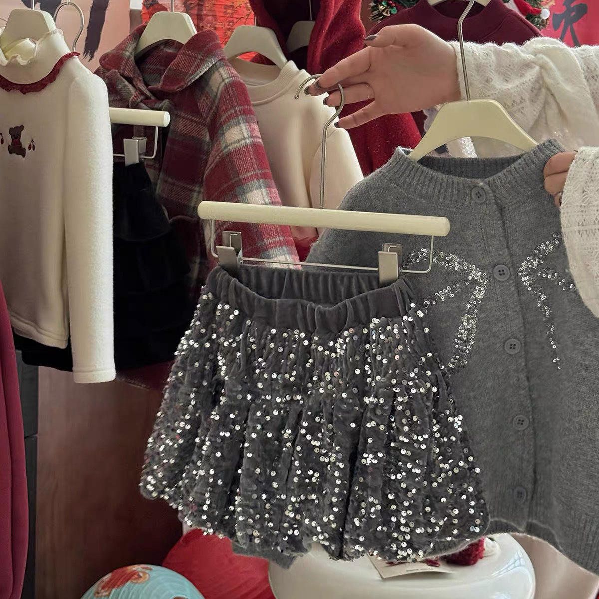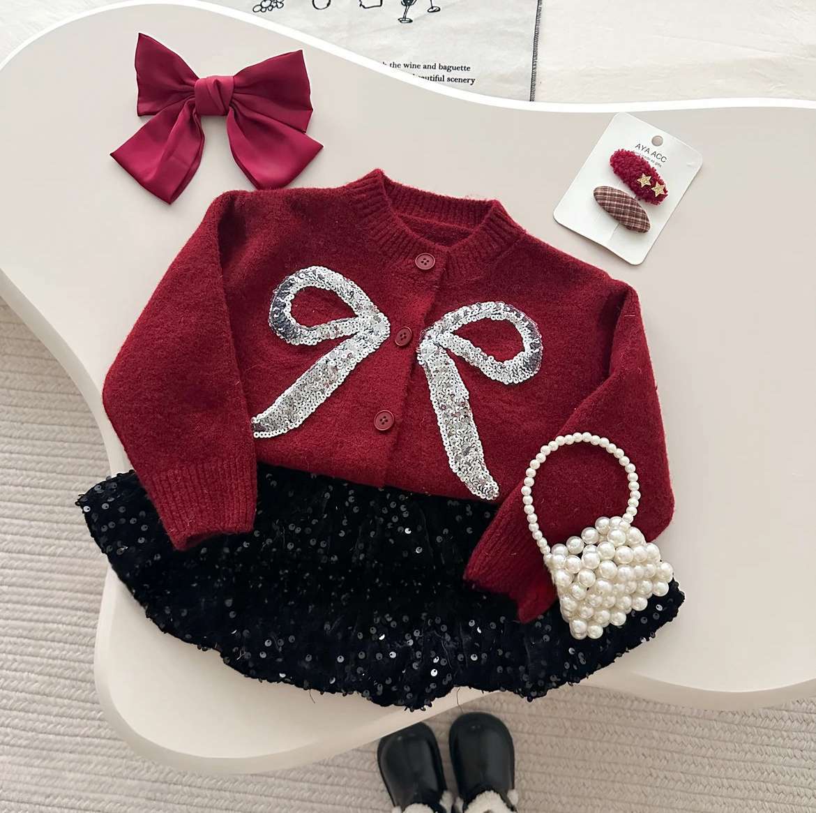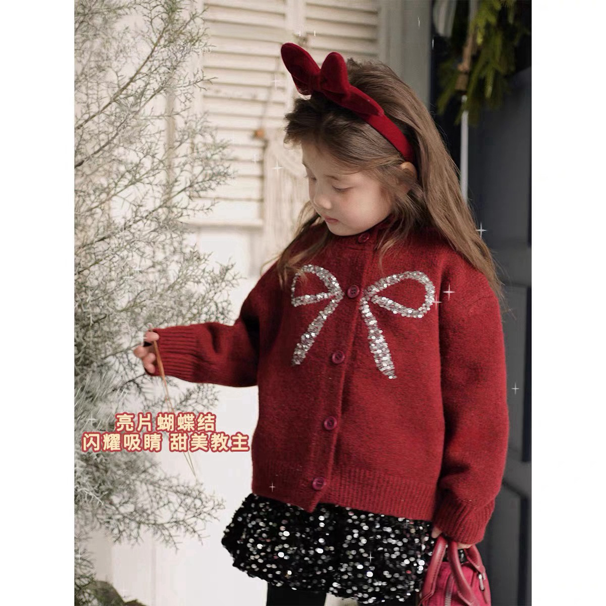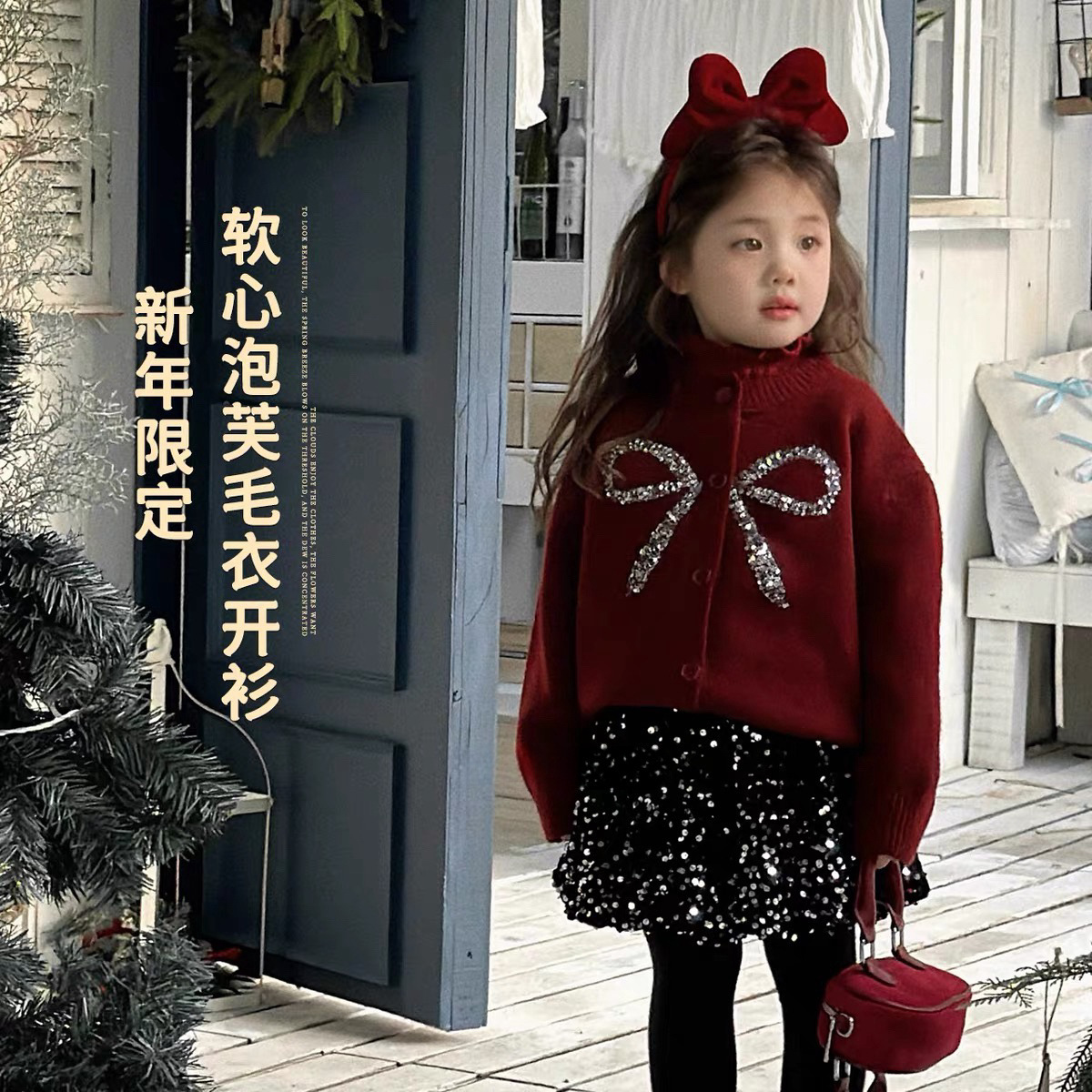 여아 겨울 안코라 레드 세트 2025 어린이 신상 카디건 새해 스웨터 스팽글 스커트 투피스 세트 트렌디