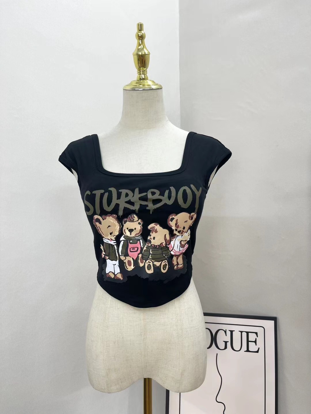 만화 곰 인쇄 슬링 여성용 핫 걸스 배벨에 노출 된 짧은 반팔 조끼 슬림 핏 슬림 여름 외복베이스 탑
