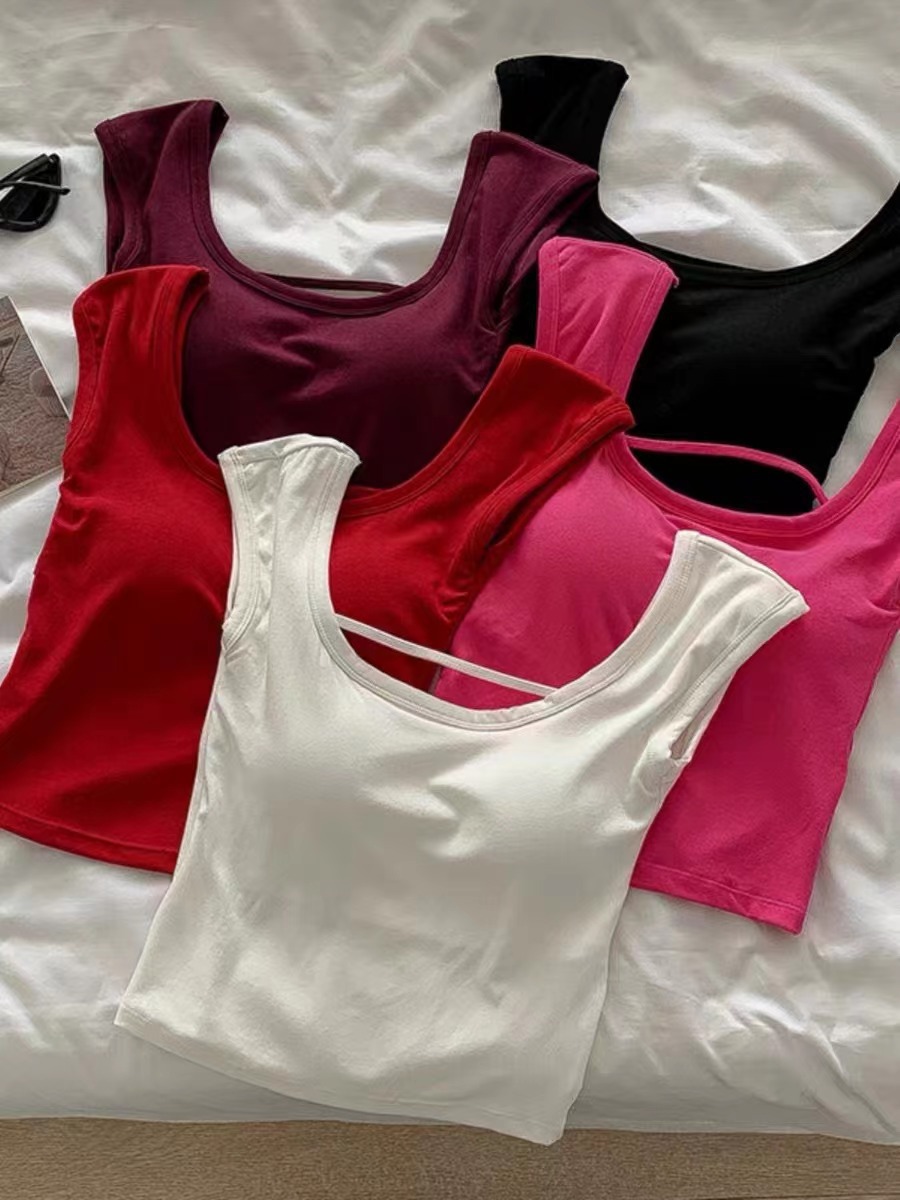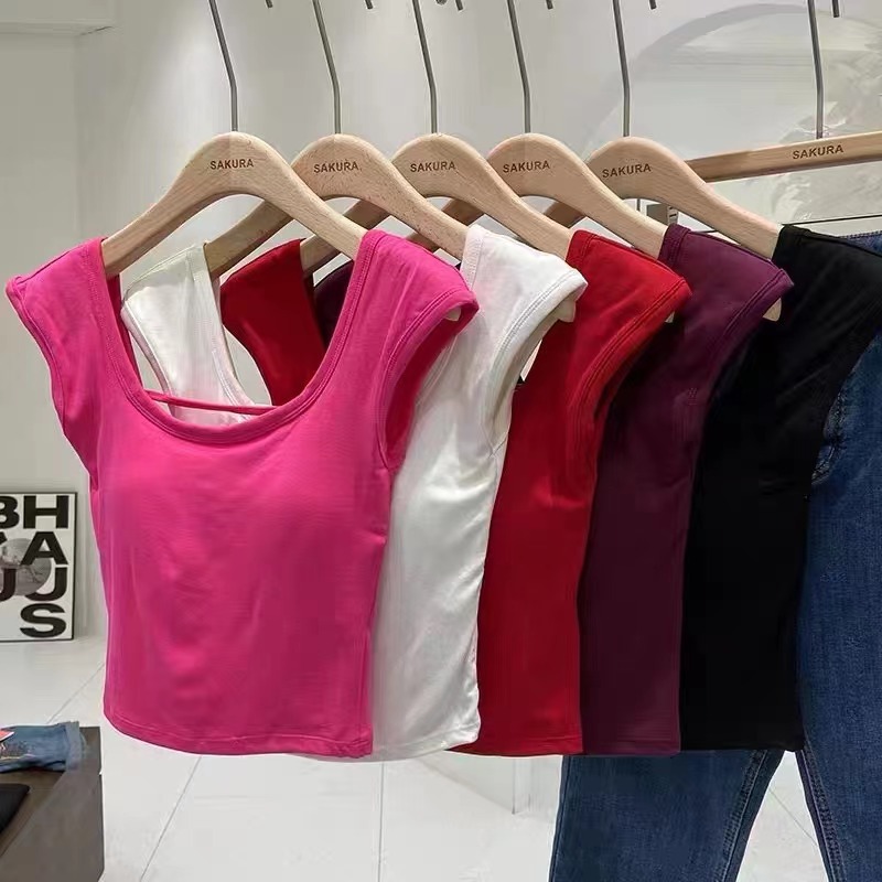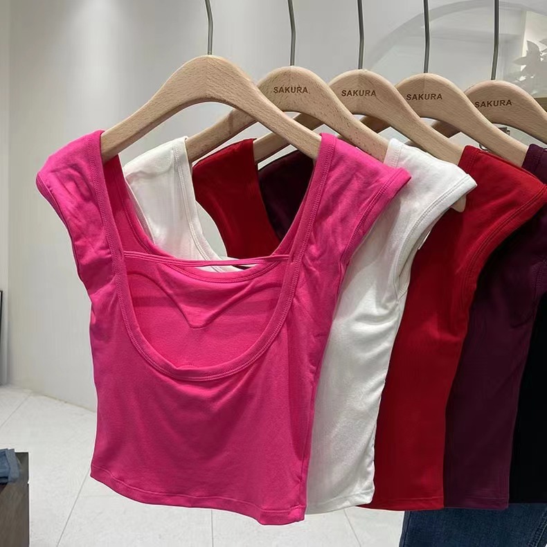 1849 # 퓨어 스파이스 걸 디자인 센스 조끼 미국 스타일 숄더 바 섹시한 티셔츠 가슴 스퀘어 칼라 탑스토어 가기