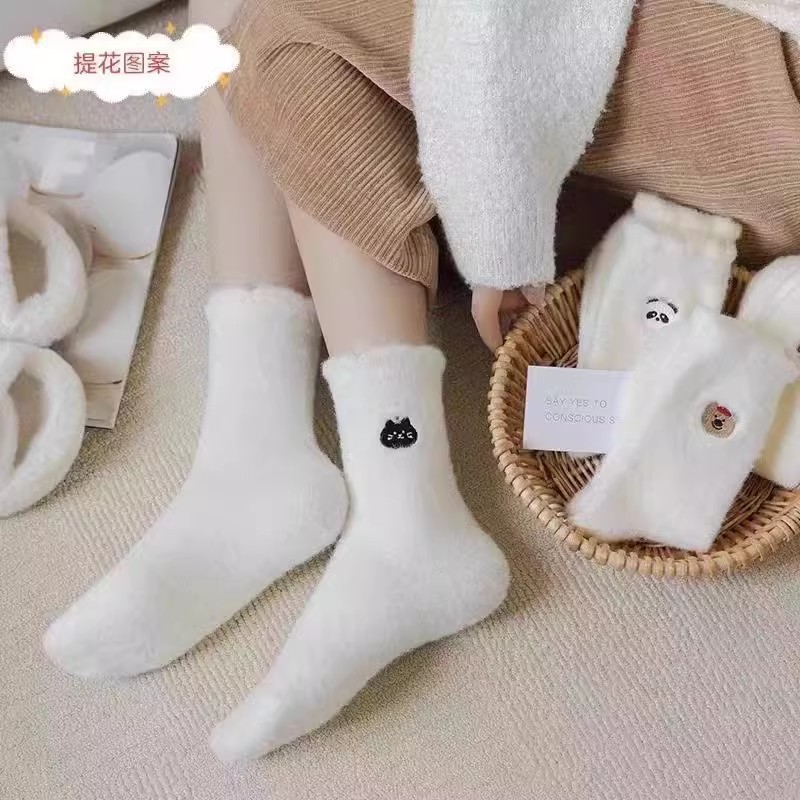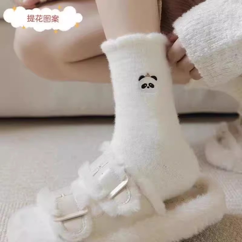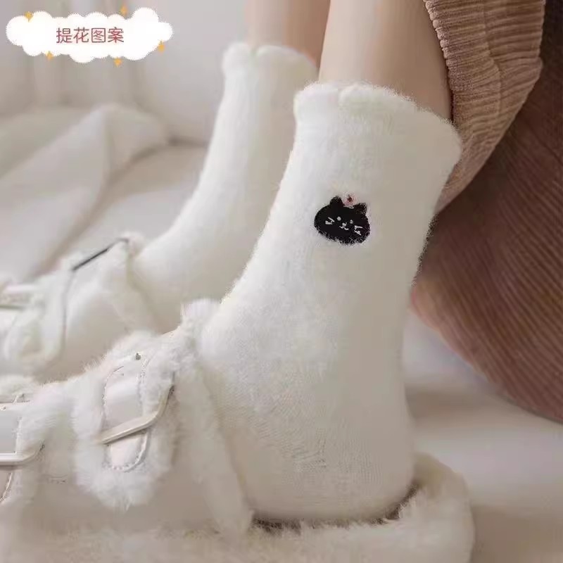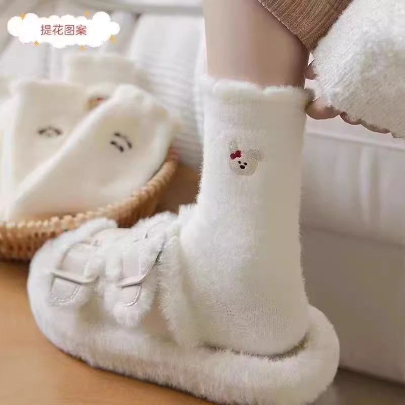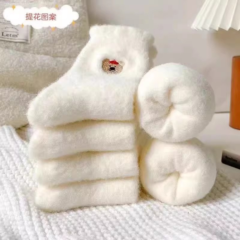 순수한 흰색 일본 호주 벨벳 수면 양말 여성용 중간 튜브 플러스 벨벳 겨울 두꺼운 따뜻한 플러시 귀여운 홈 양말스토어 가기