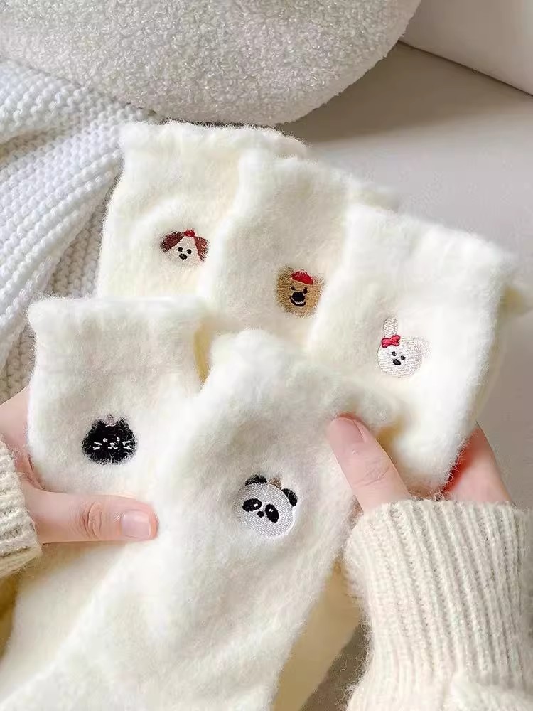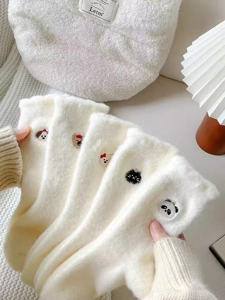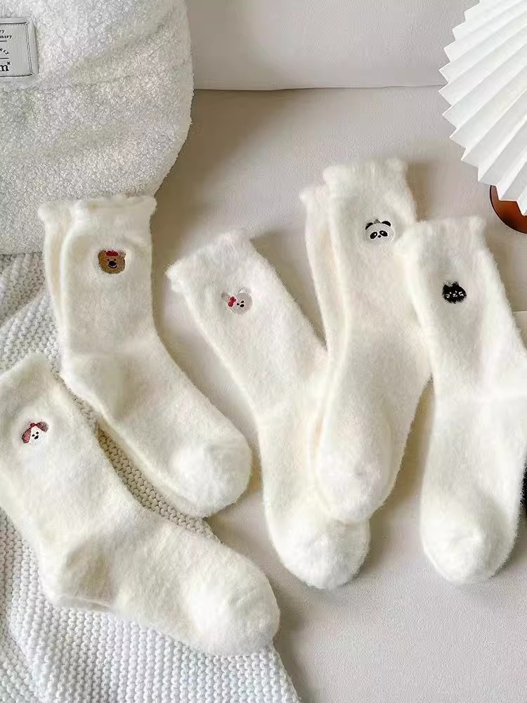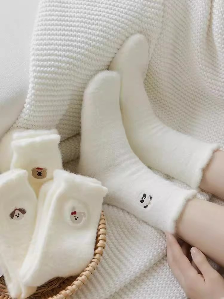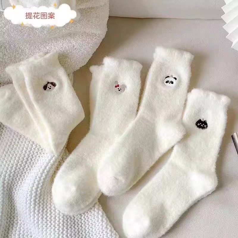 순수한 흰색 일본 호주 벨벳 수면 양말 여성용 중간 튜브 플러스 벨벳 겨울 두꺼운 따뜻한 플러시 귀여운 홈 양말스토어 가기