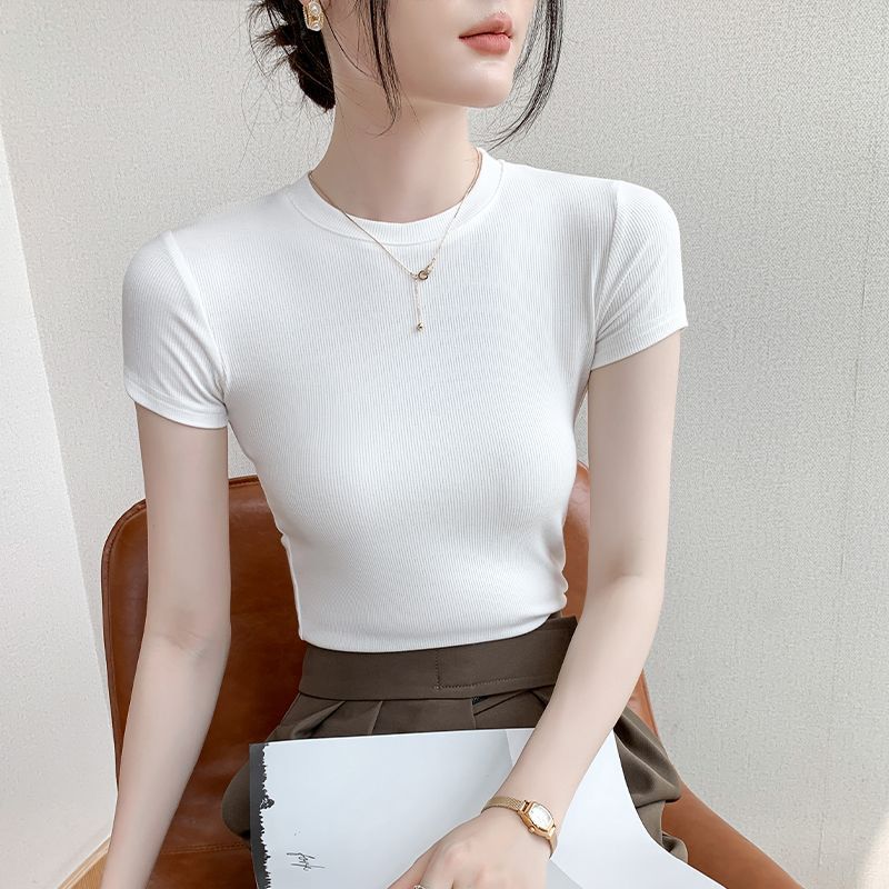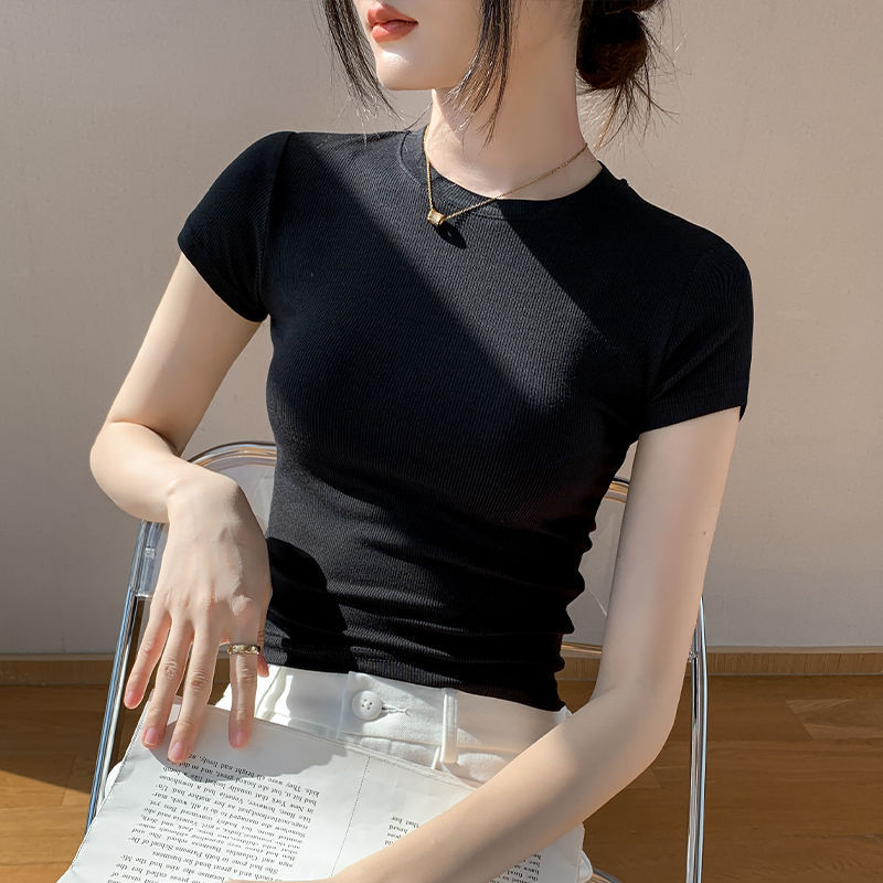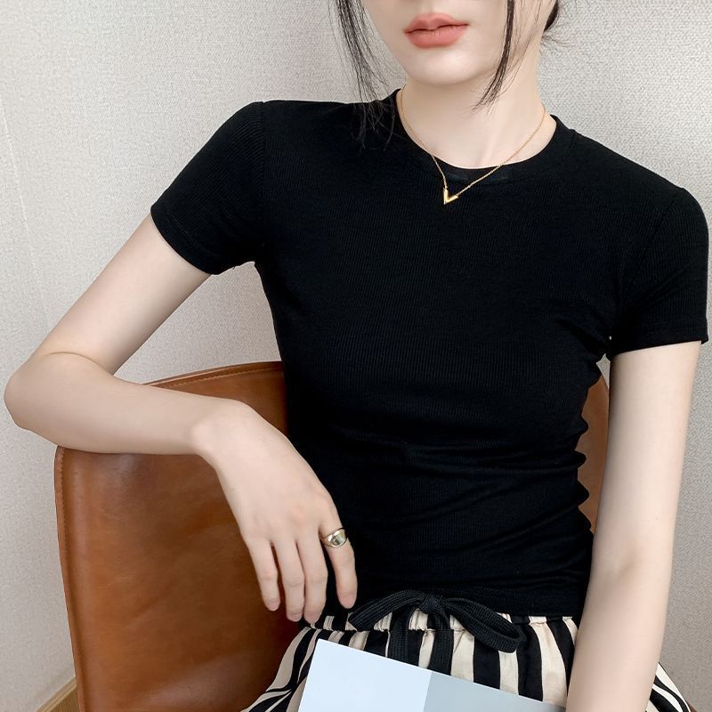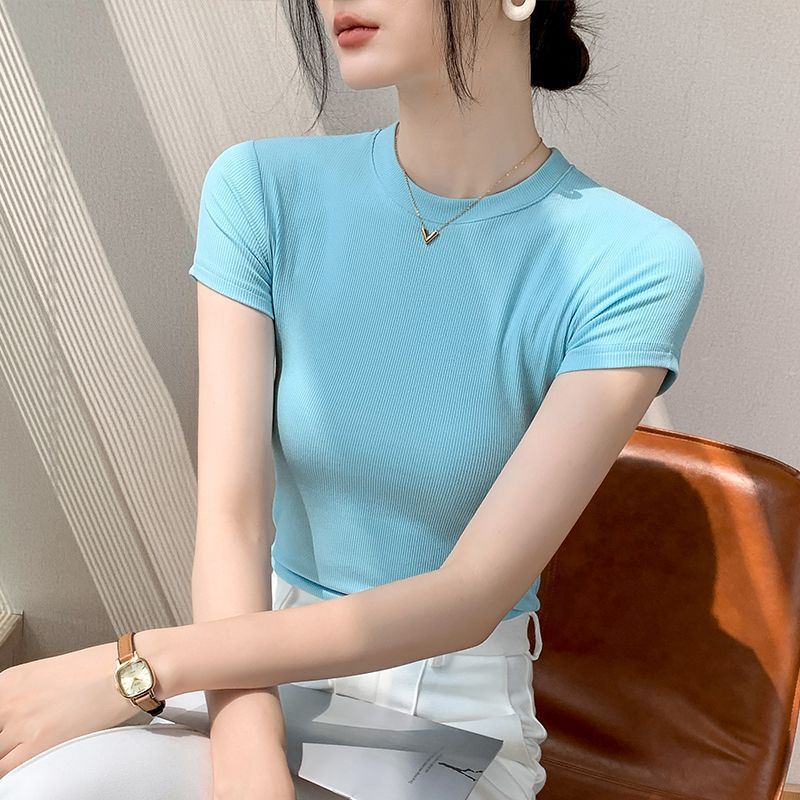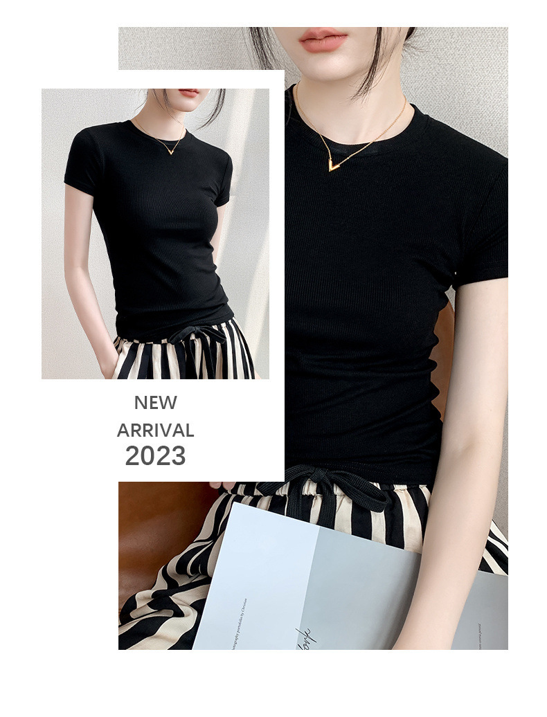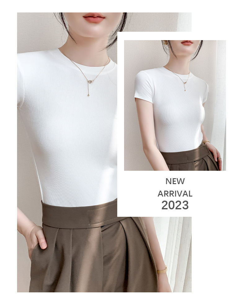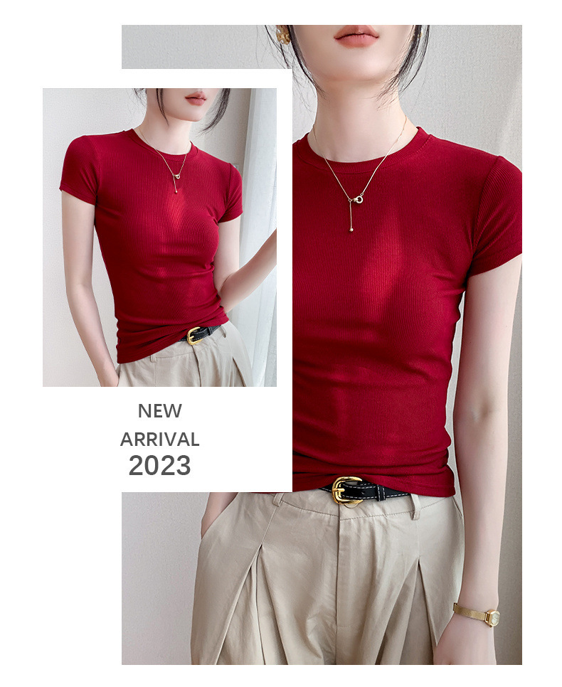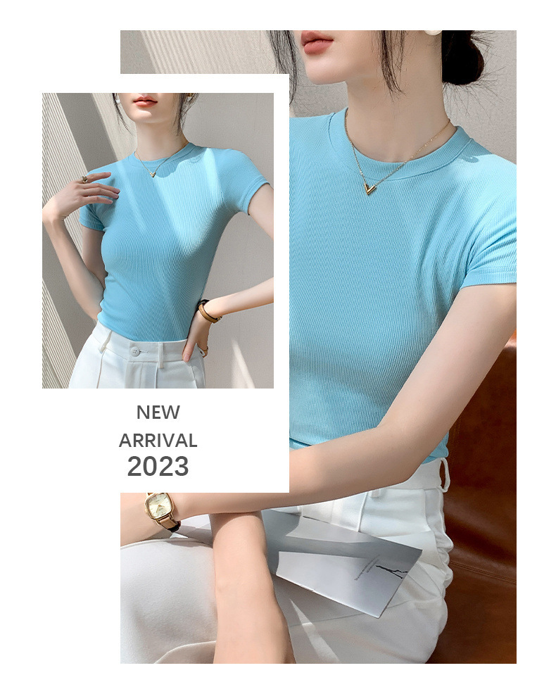 둥근 목 반팔 티셔츠 여자 2023 년 여름 새 어깨 꽉 허리 슬리밍 얇은 단색 간단한 올매치 탑