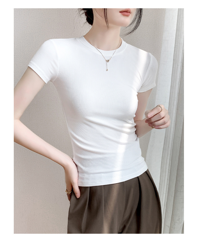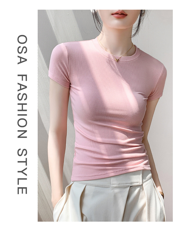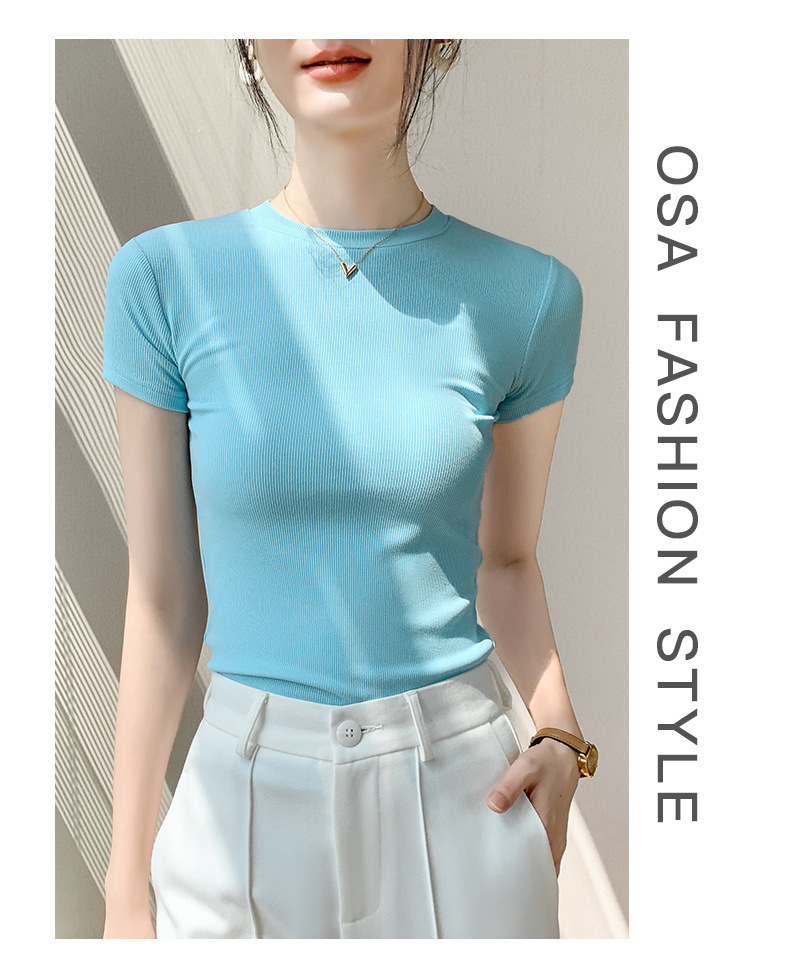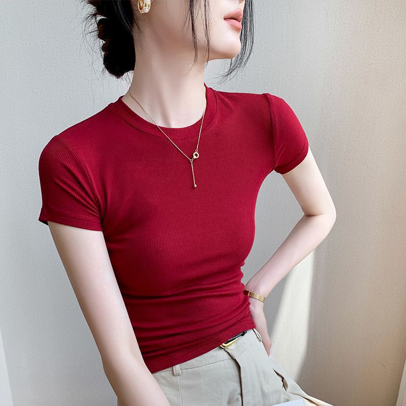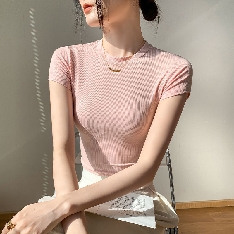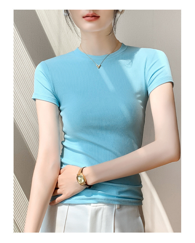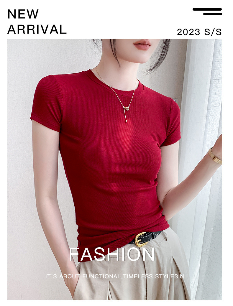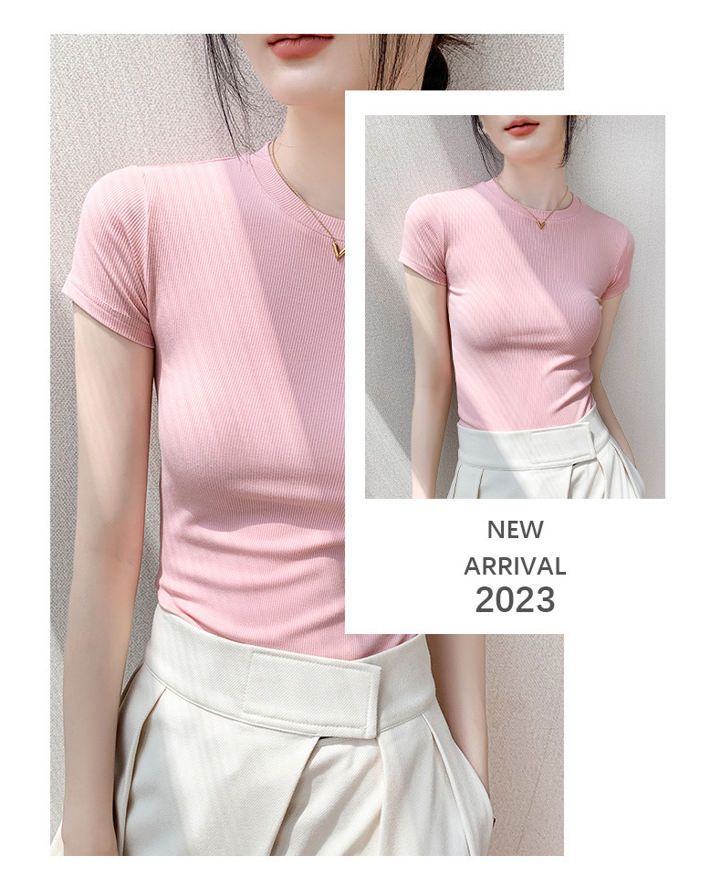 둥근 목 반팔 티셔츠 여자 2023 년 여름 새 어깨 꽉 허리 슬리밍 얇은 단색 간단한 올매치 탑