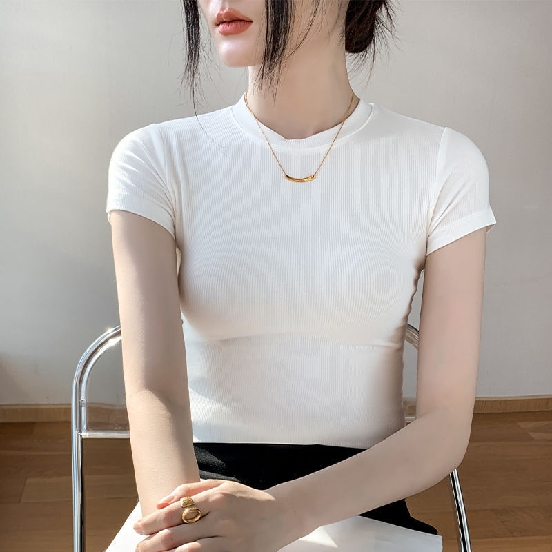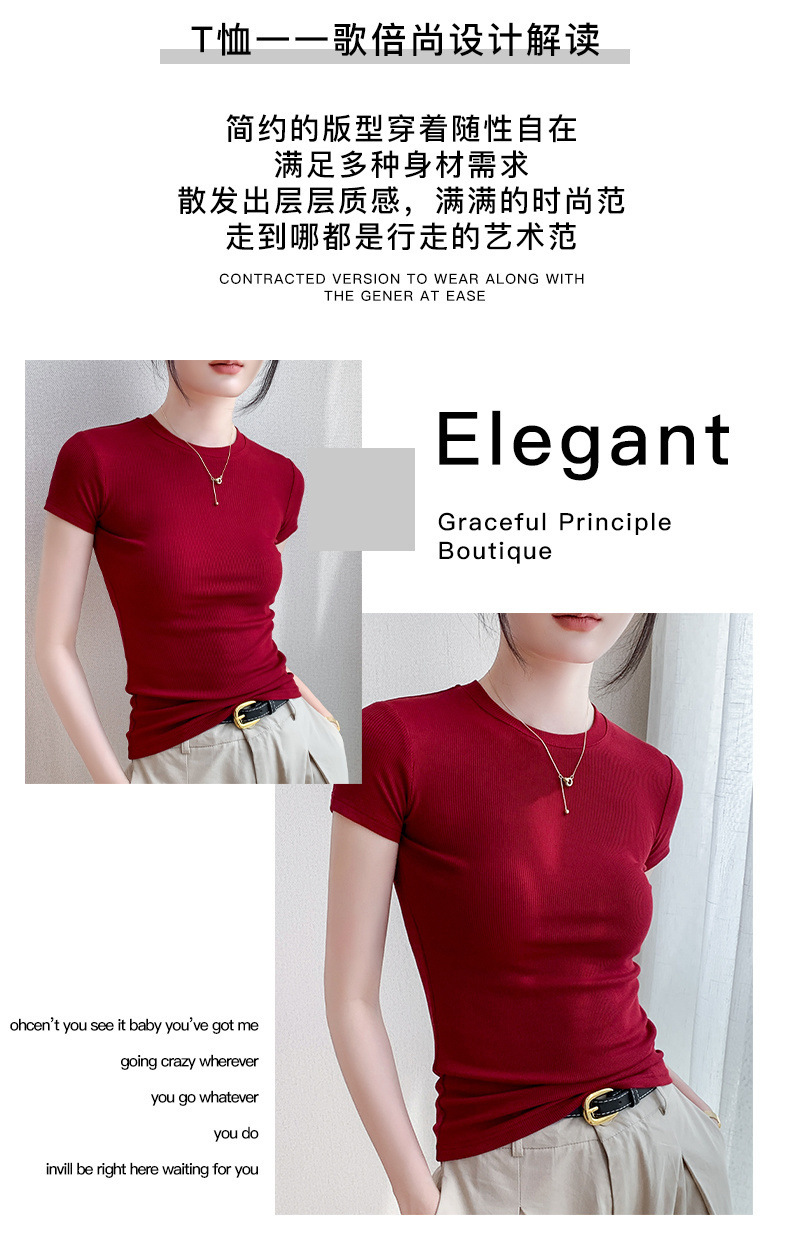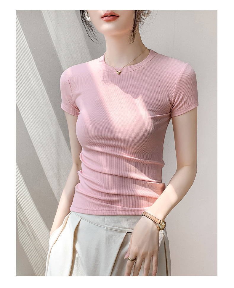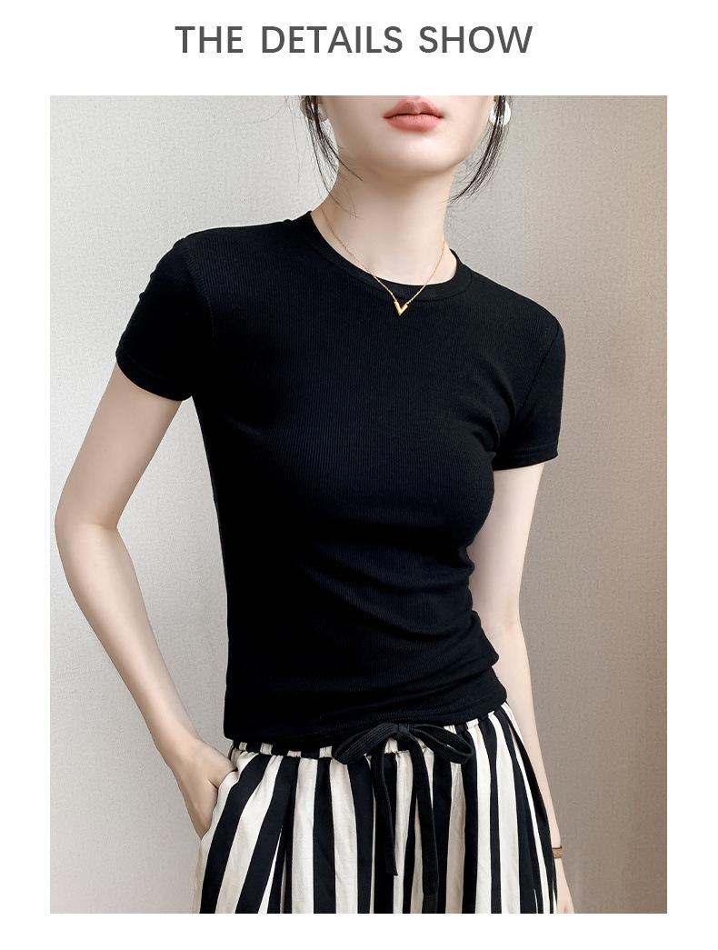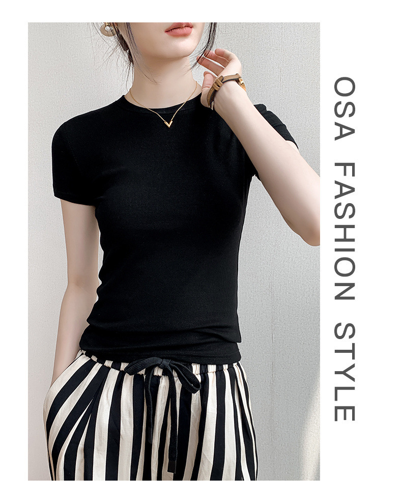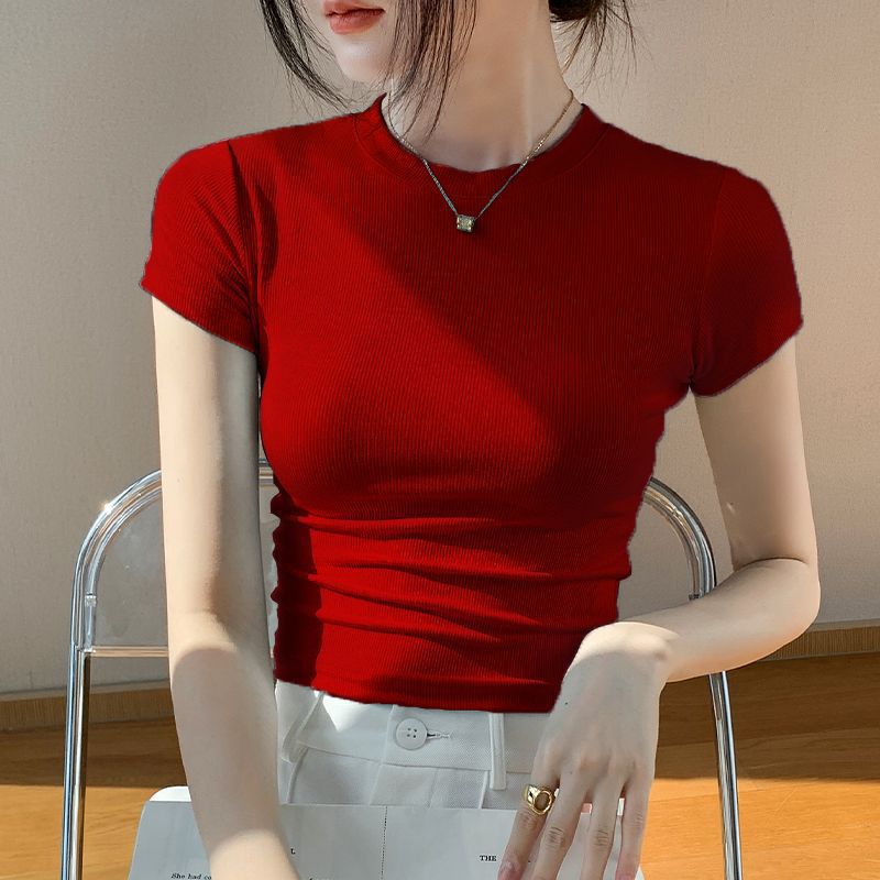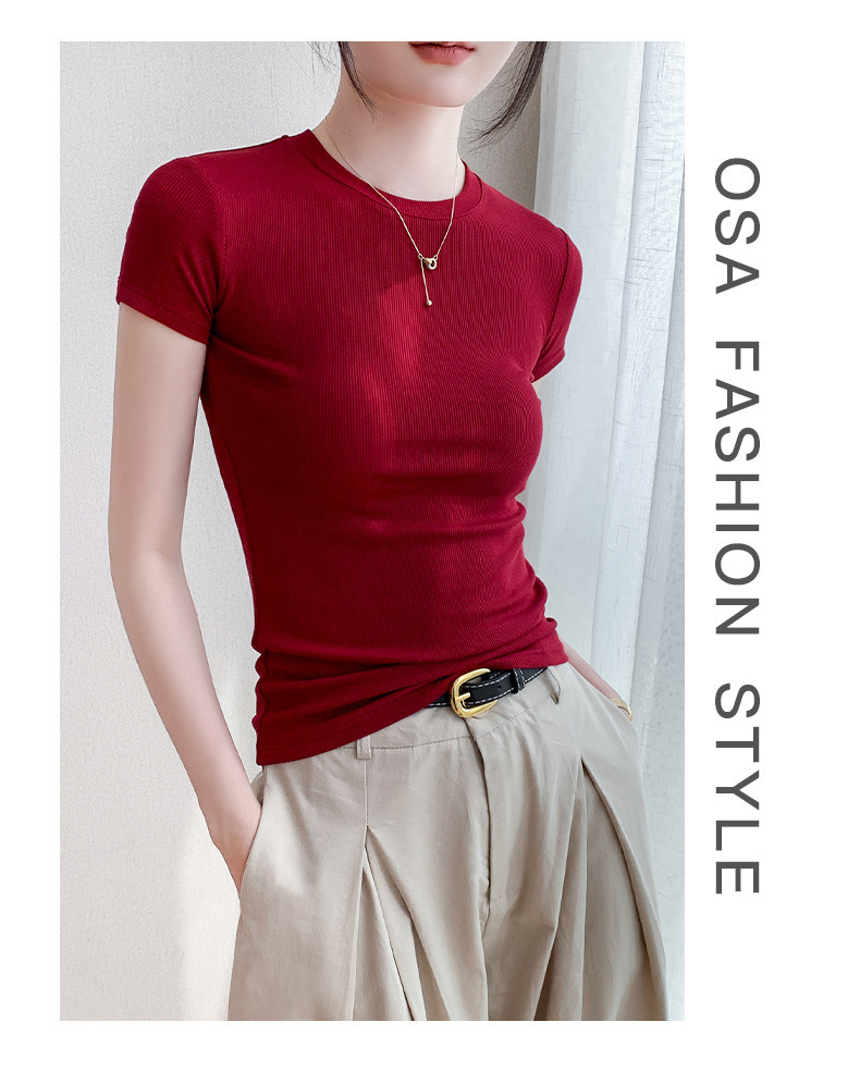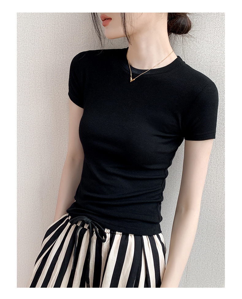 둥근 목 반팔 티셔츠 여자 2023 년 여름 새 어깨 꽉 허리 슬리밍 얇은 단색 간단한 올매치 탑