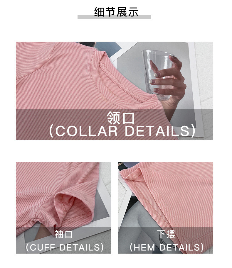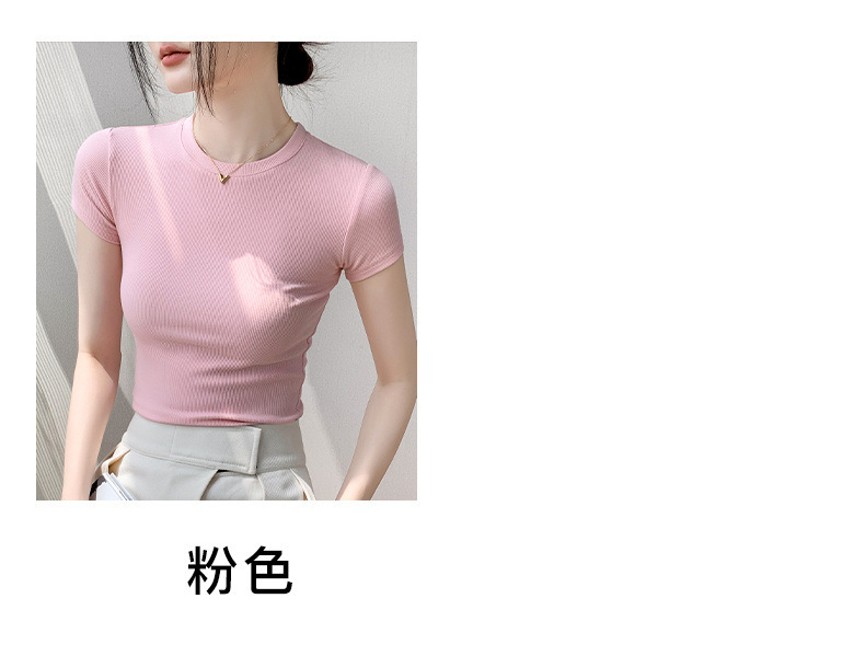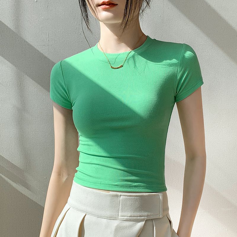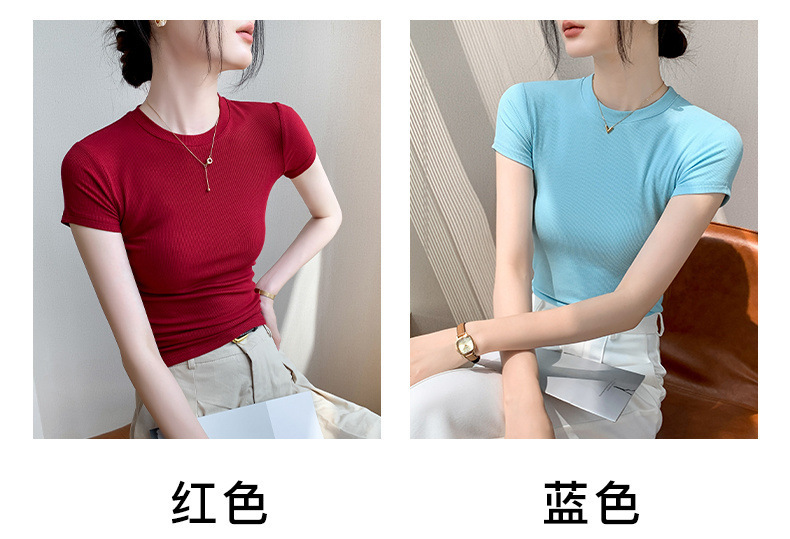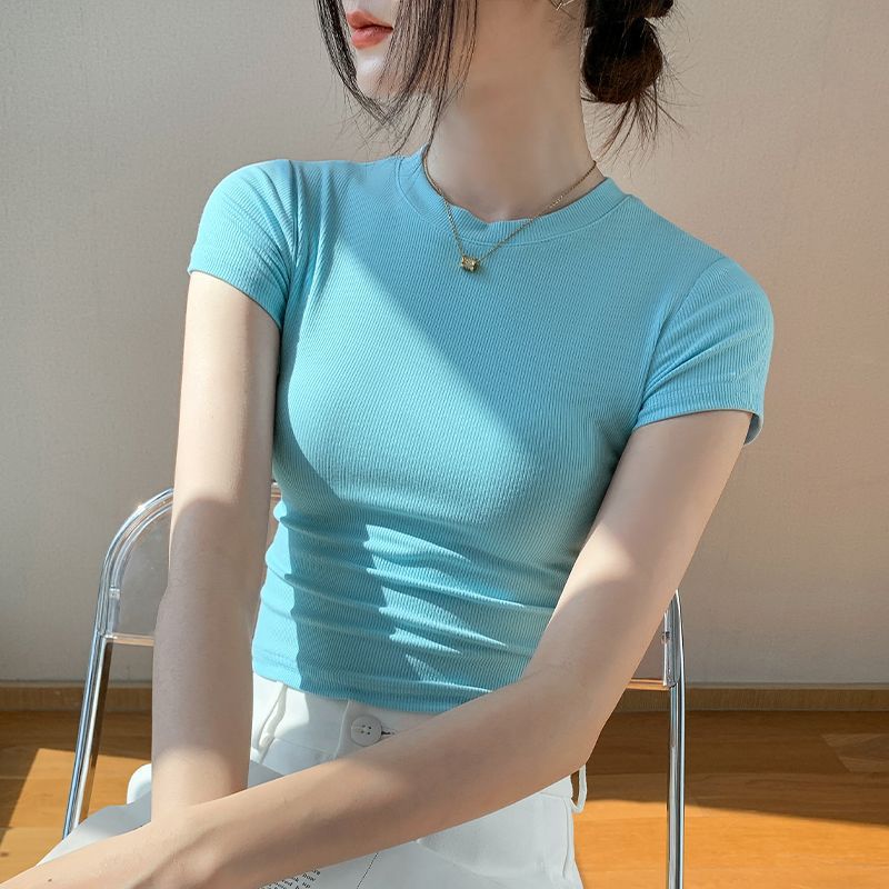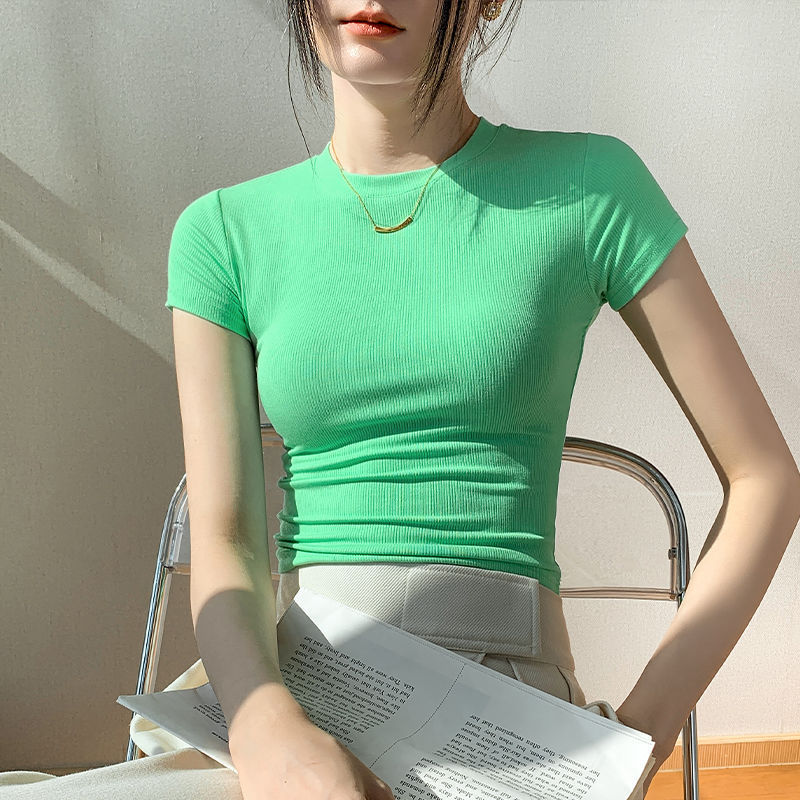 둥근 목 반팔 티셔츠 여자 2023 년 여름 새 어깨 꽉 허리 슬리밍 얇은 단색 간단한 올매치 탑스토어 가기